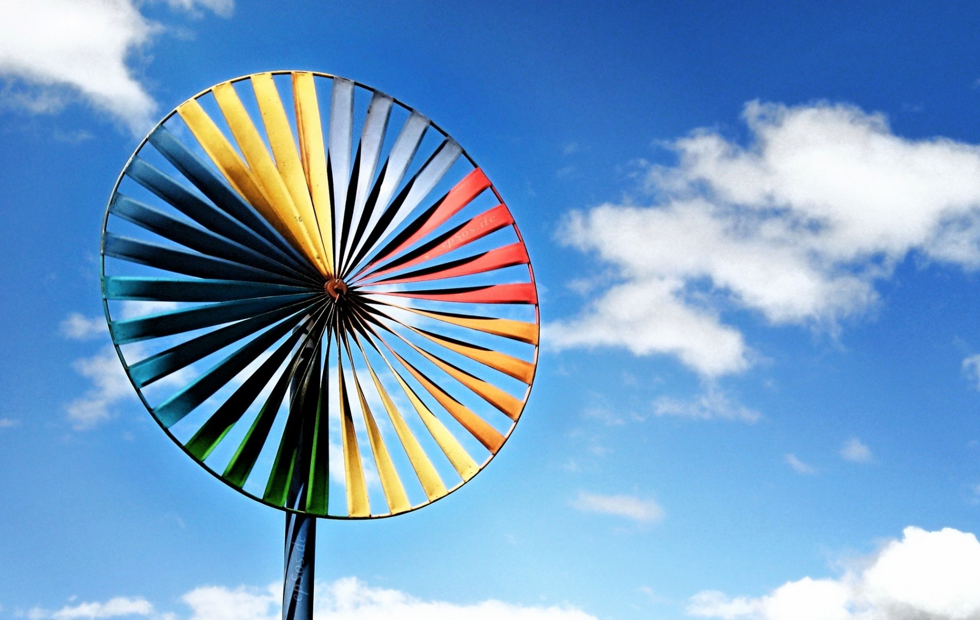 Windige farbige Turbine auf einem blauen Himmelshintergrund