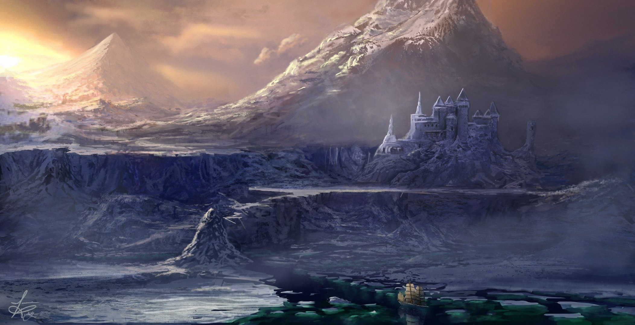 Landschaft Burg Fluss Berge