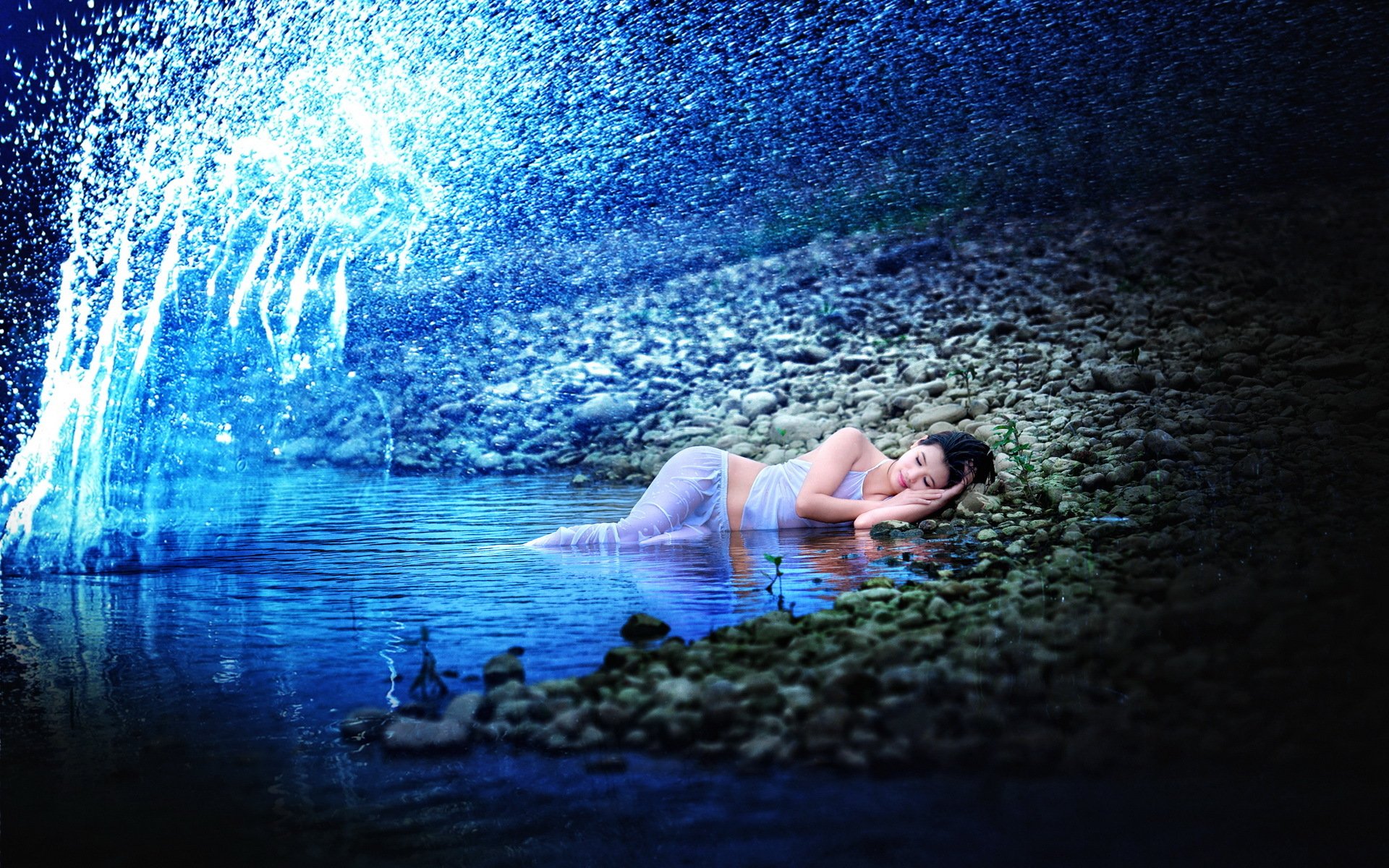 Mädchen sitzt am Ufer mit einem Schwert in den Händen