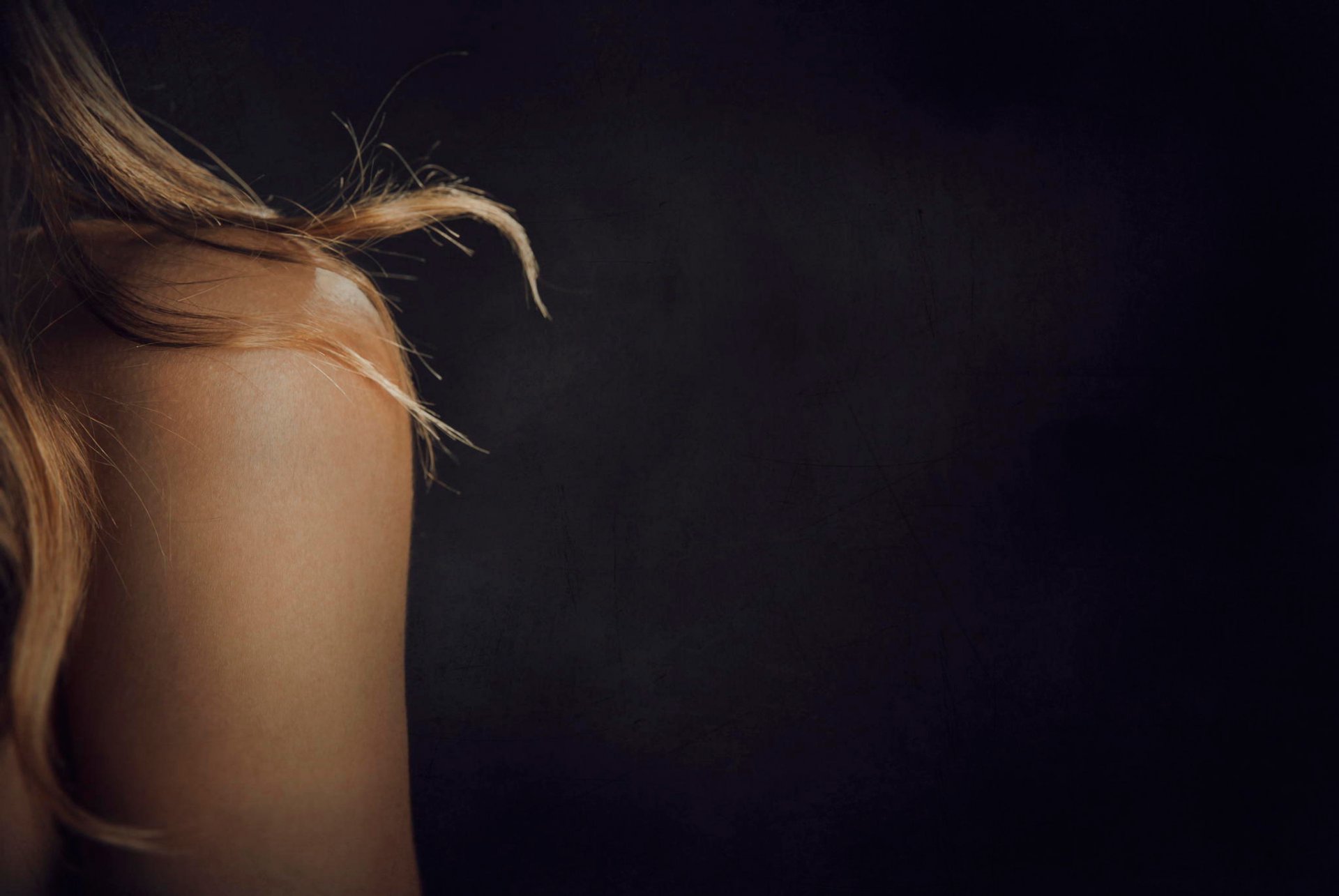 Blonde Locken auf der Schulter eines jungen Mädchens. Dunkler Hintergrund