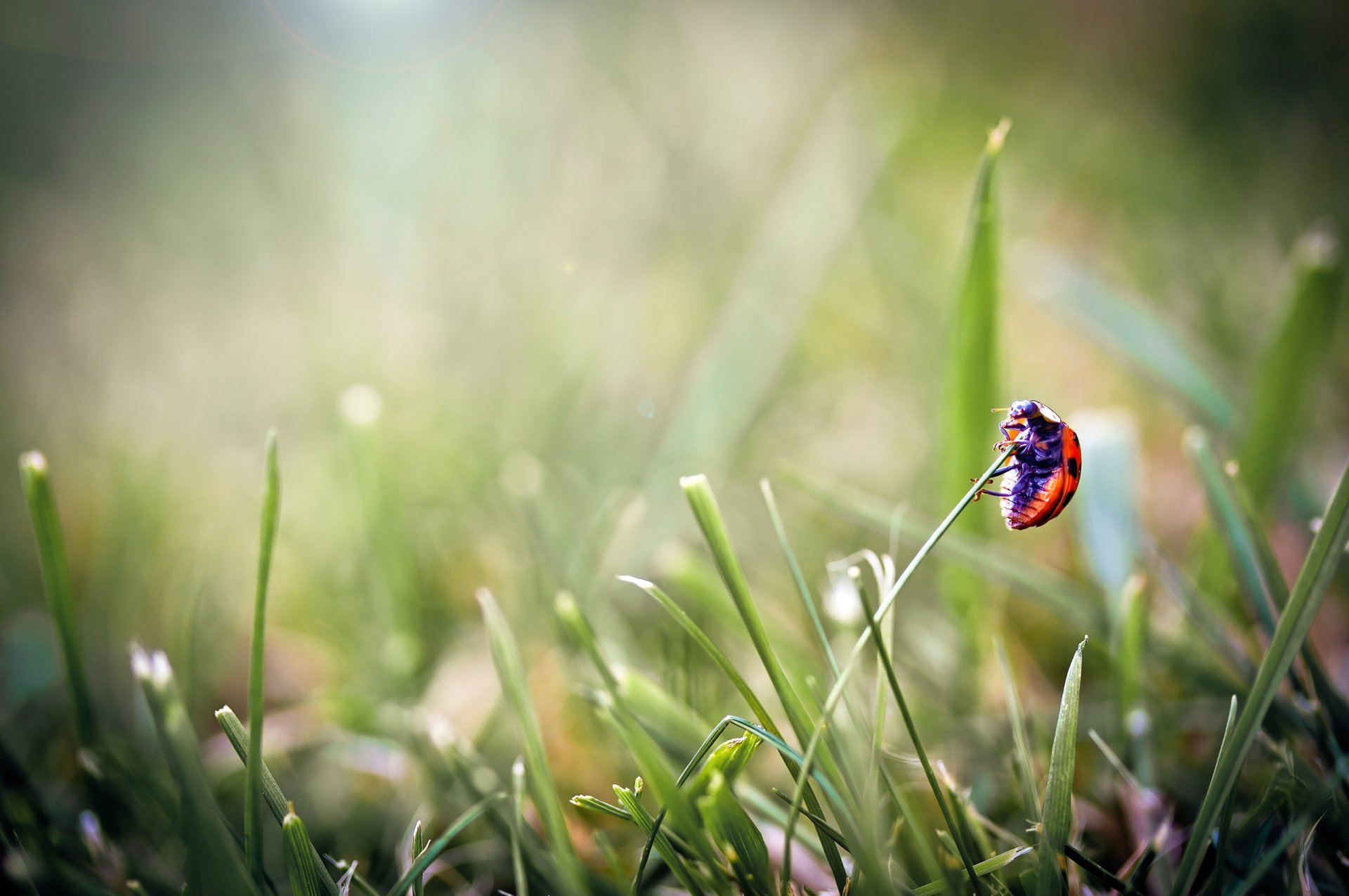 Der Marienkäfer ist auf Gras gekrochen und versucht abzuheben