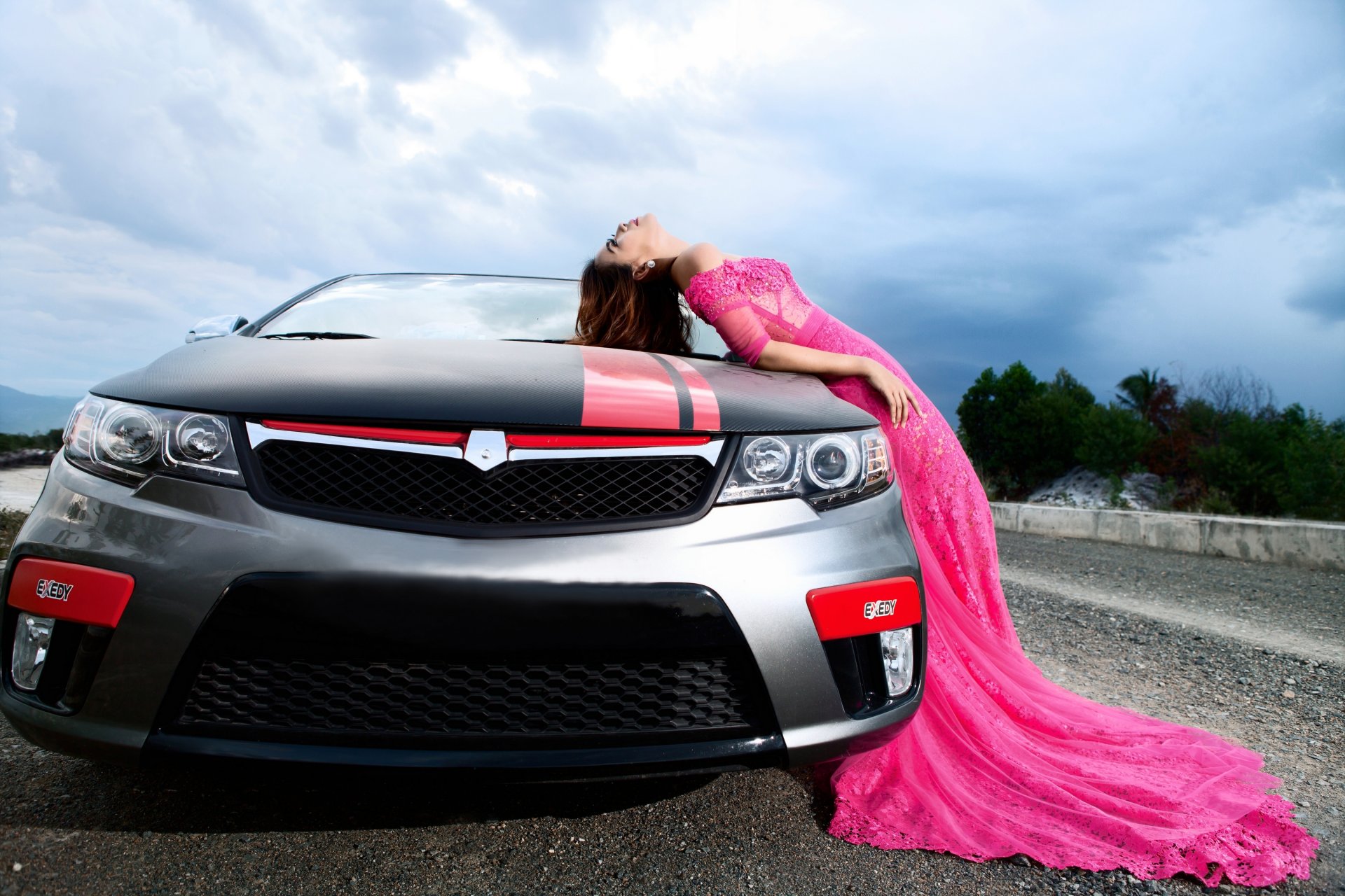 Ein grau-rotes Auto fährt mit Geschwindigkeit auf der Straße