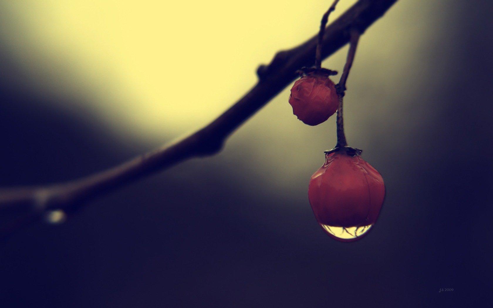 Drei Tropfen Wasser auf grünen Blättern auf verschwommenem Hintergrund
