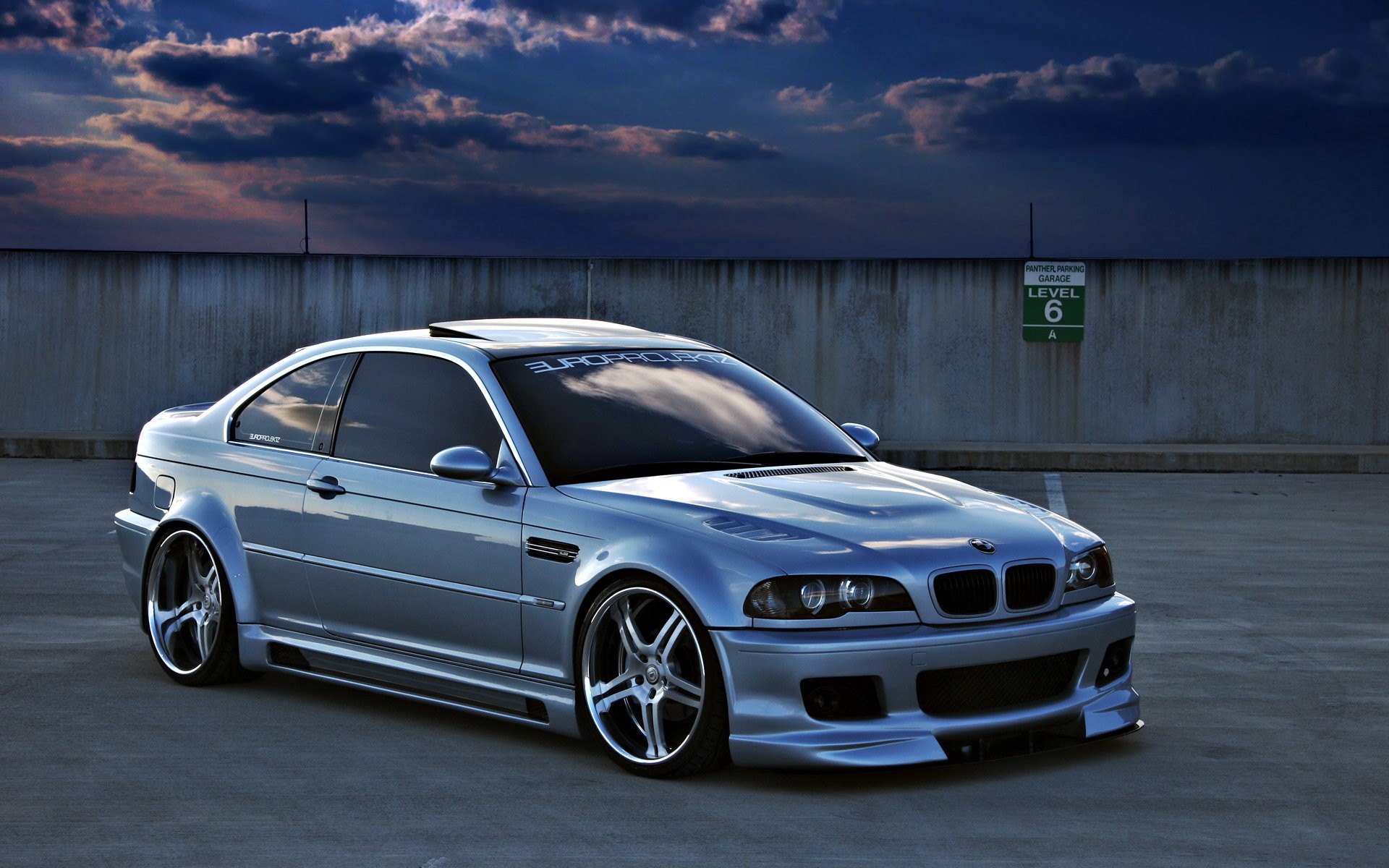 Grauer Sportwagen vor dem Hintergrund von Himmel und Wolken