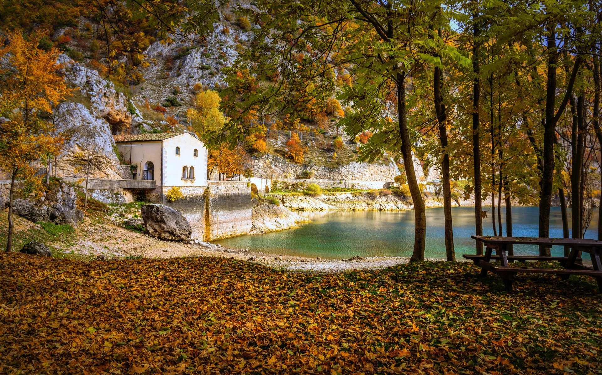 Haus im Herbst in der Nähe des Teiches bei Sonnenuntergang