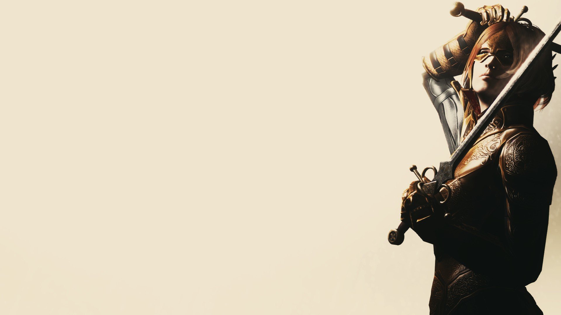 Asiatische Mädchen im weißen Kleid mit einem Schwert auf der Schulter