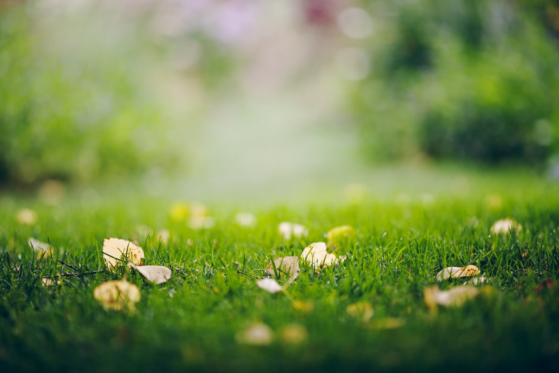 Nasse Blütenblätter auf grünem Gras Hintergrund
