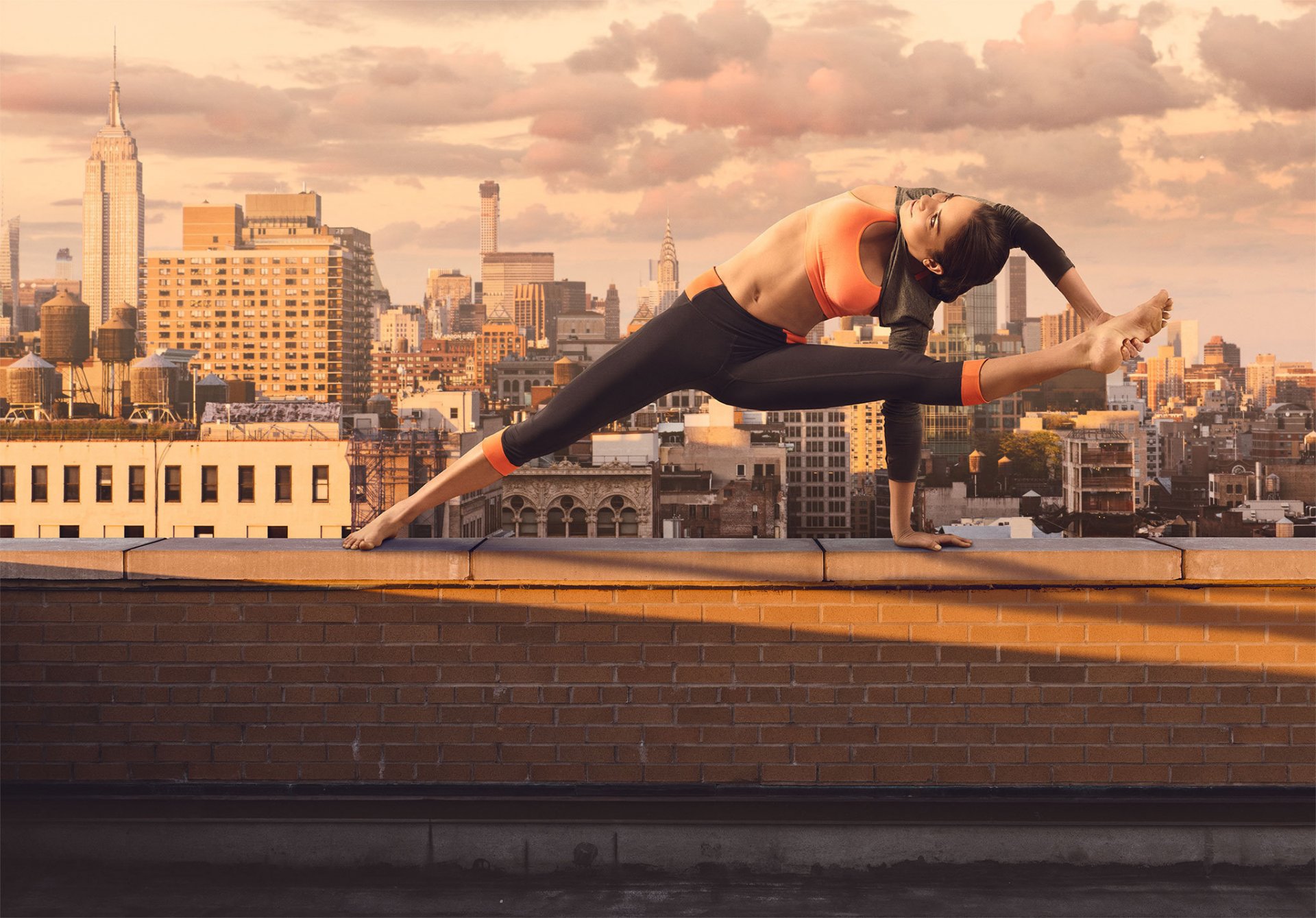 Sportliches Mädchen macht Vorsorge beim Dehnen auf dem Dach