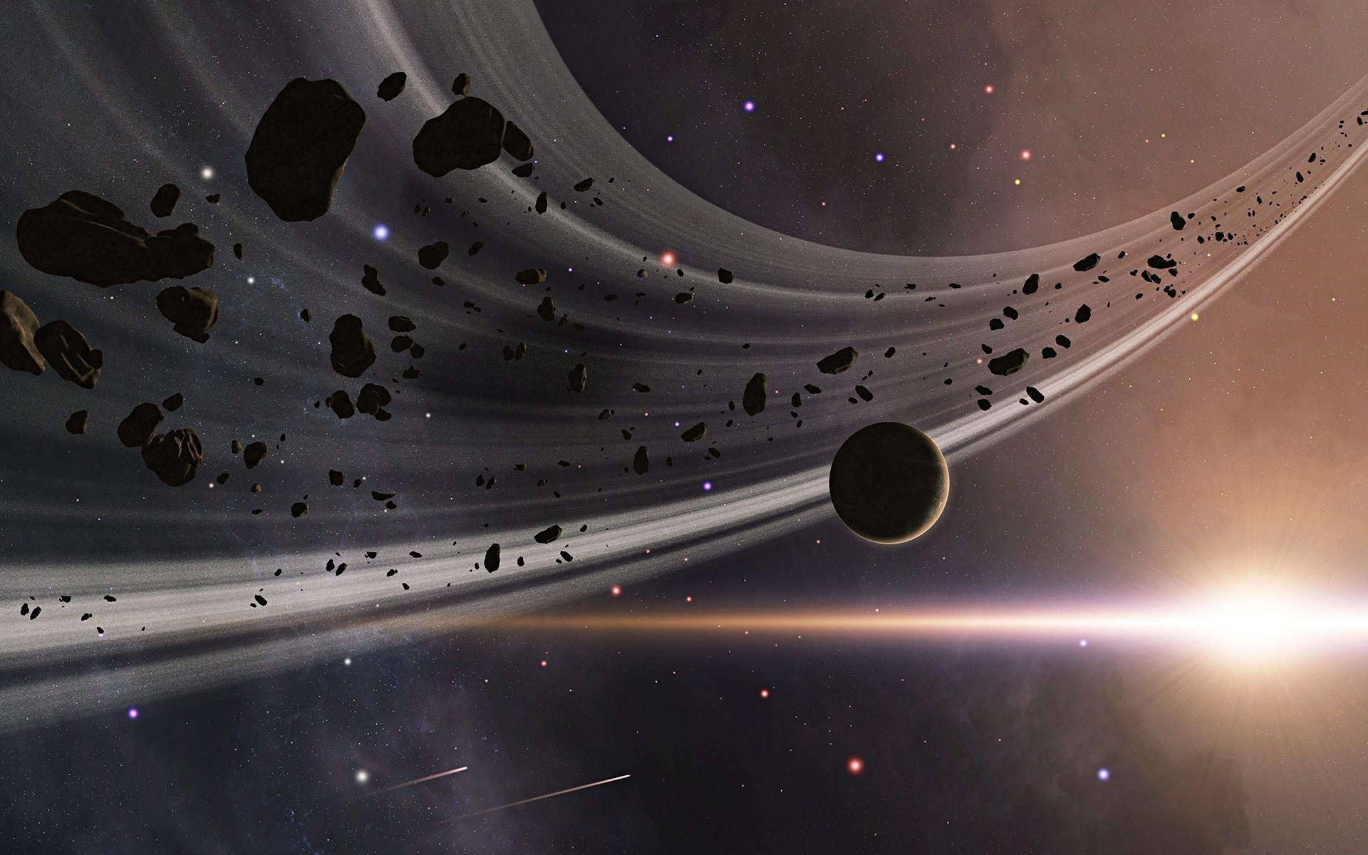 Kosmische Landschaft. Asteroiden im Orbit eines Planeten