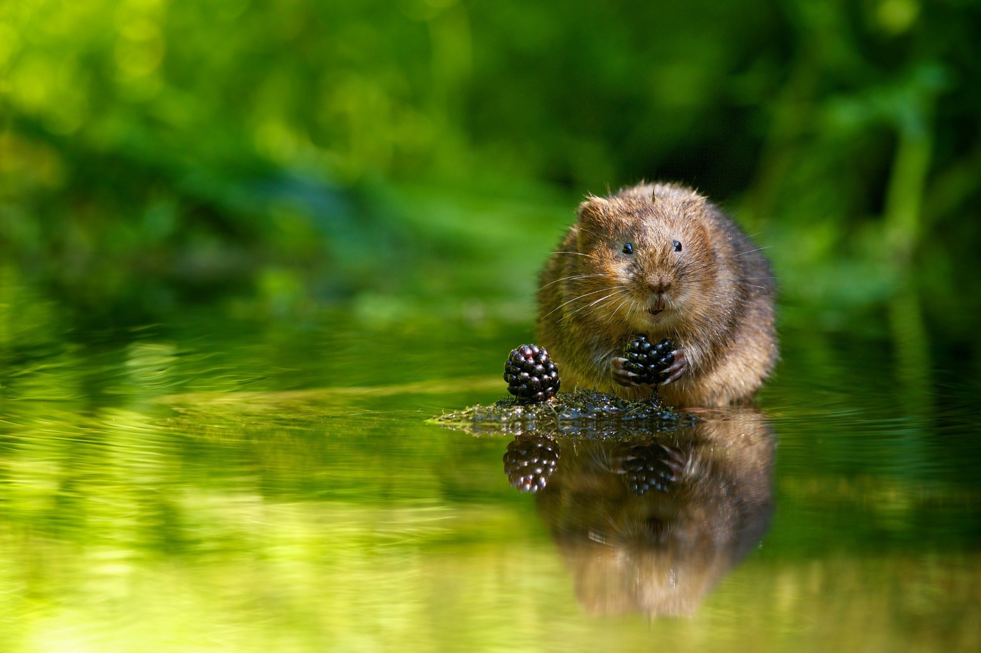 Eine Wühlmaus frisst Beeren auf einer Insel inmitten eines Flusses