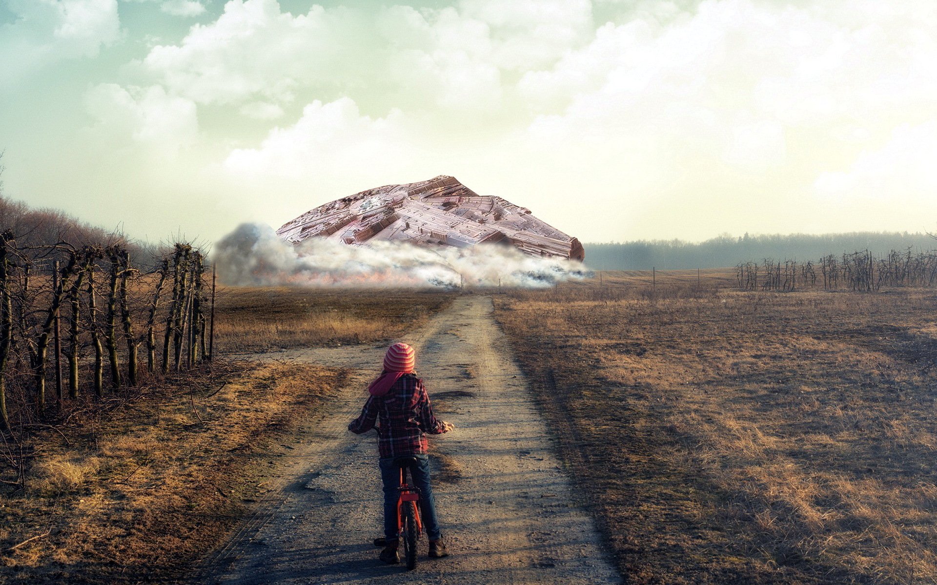 Ein Mädchen auf einem Fahrrad, das auf ein außerirdisches Schiff schaut, das auf die Erde gefallen ist, ist fantastisch