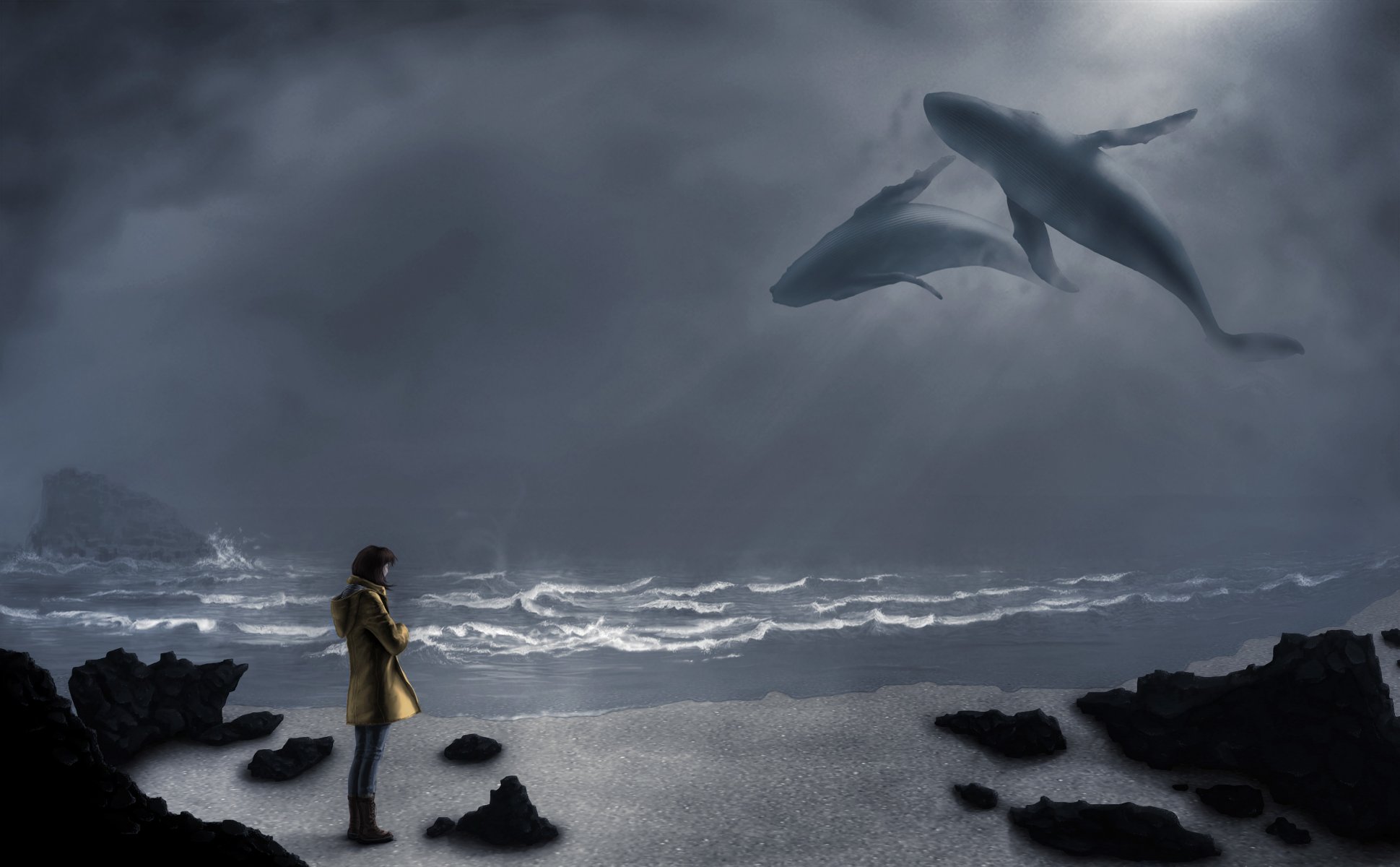 Ein Mädchen im gelben Mantel träumt von Walen an einem nebligen Ufer