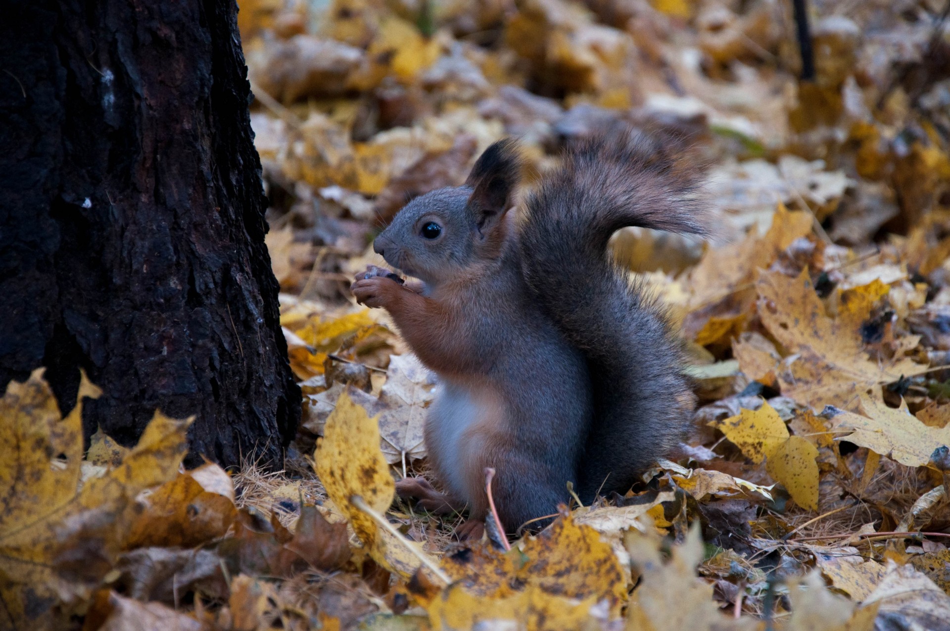 Eichhörnchen im Park, das eine Nuss serviert