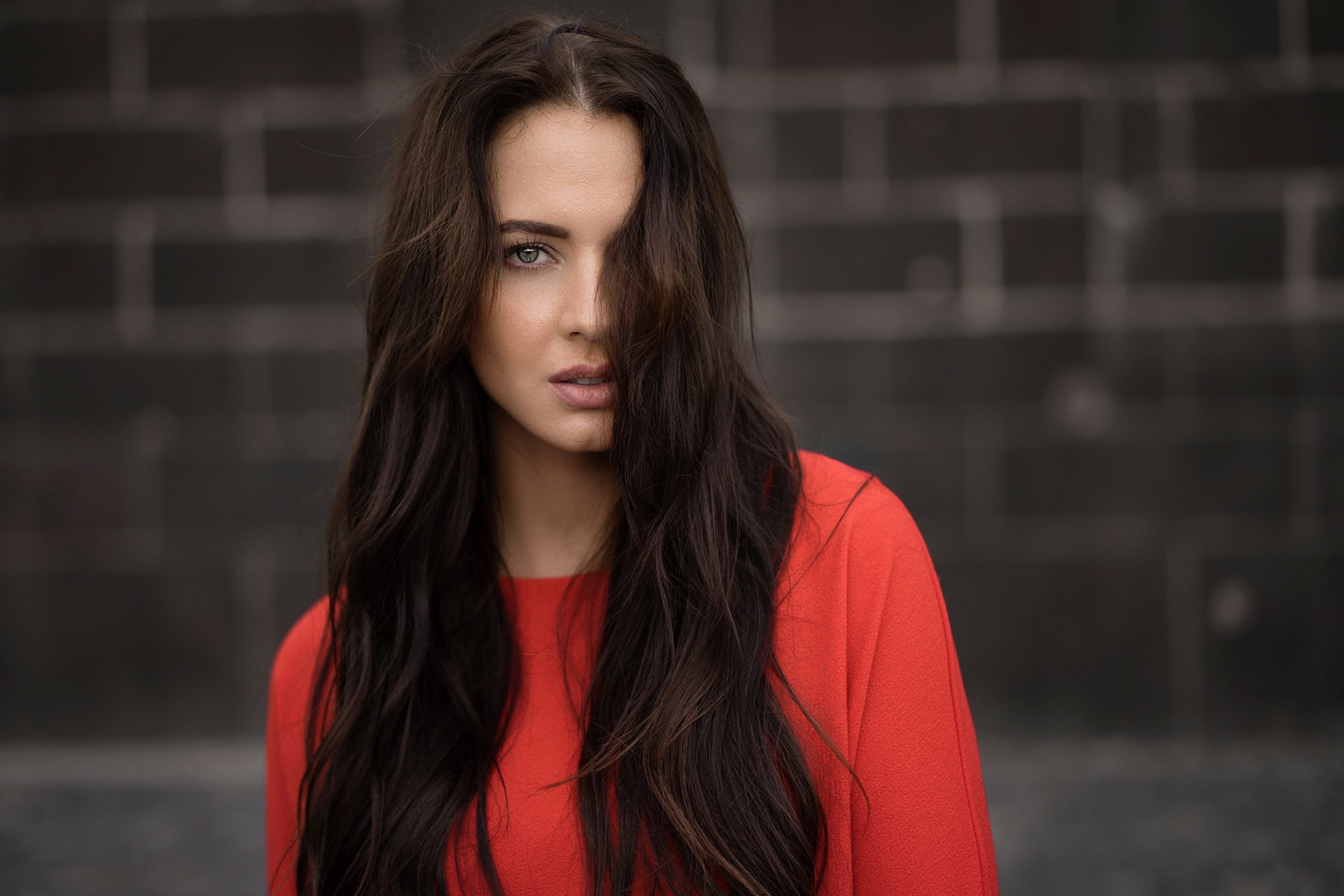 Schönes Foto eines Mädchens auf der Straße zum roten Top