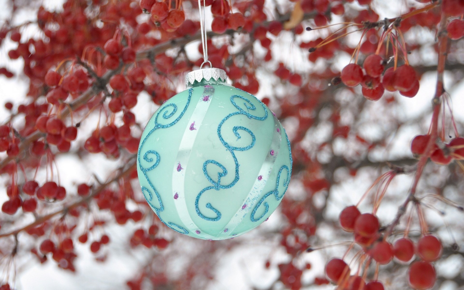 Weihnachtsbaum, türkisfarbene Kugel auf einem Hintergrund von roten Beeren