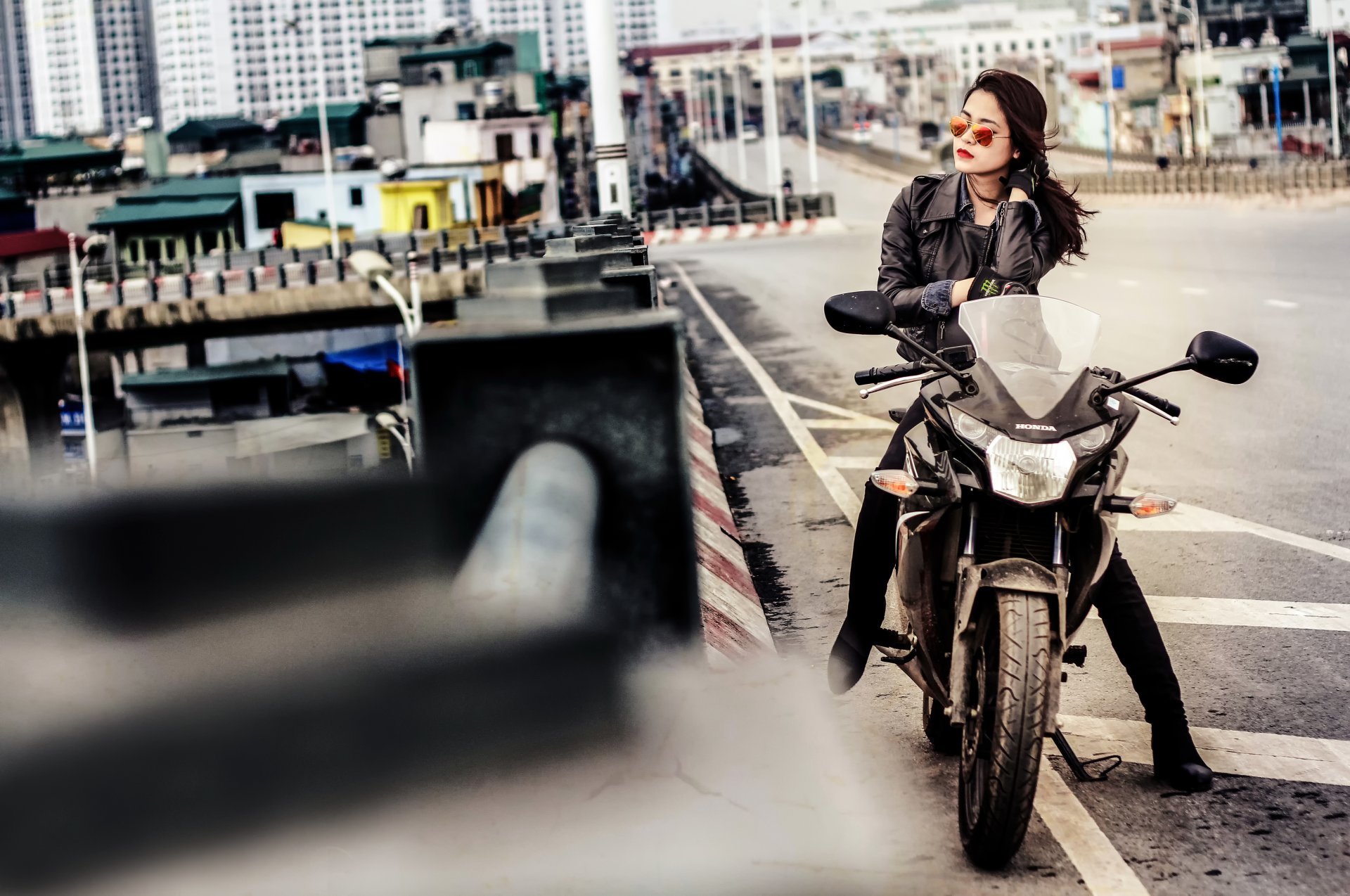 Motorrad zx - 10r mit Motorradfahrer posiert auf dunklem Hintergrund