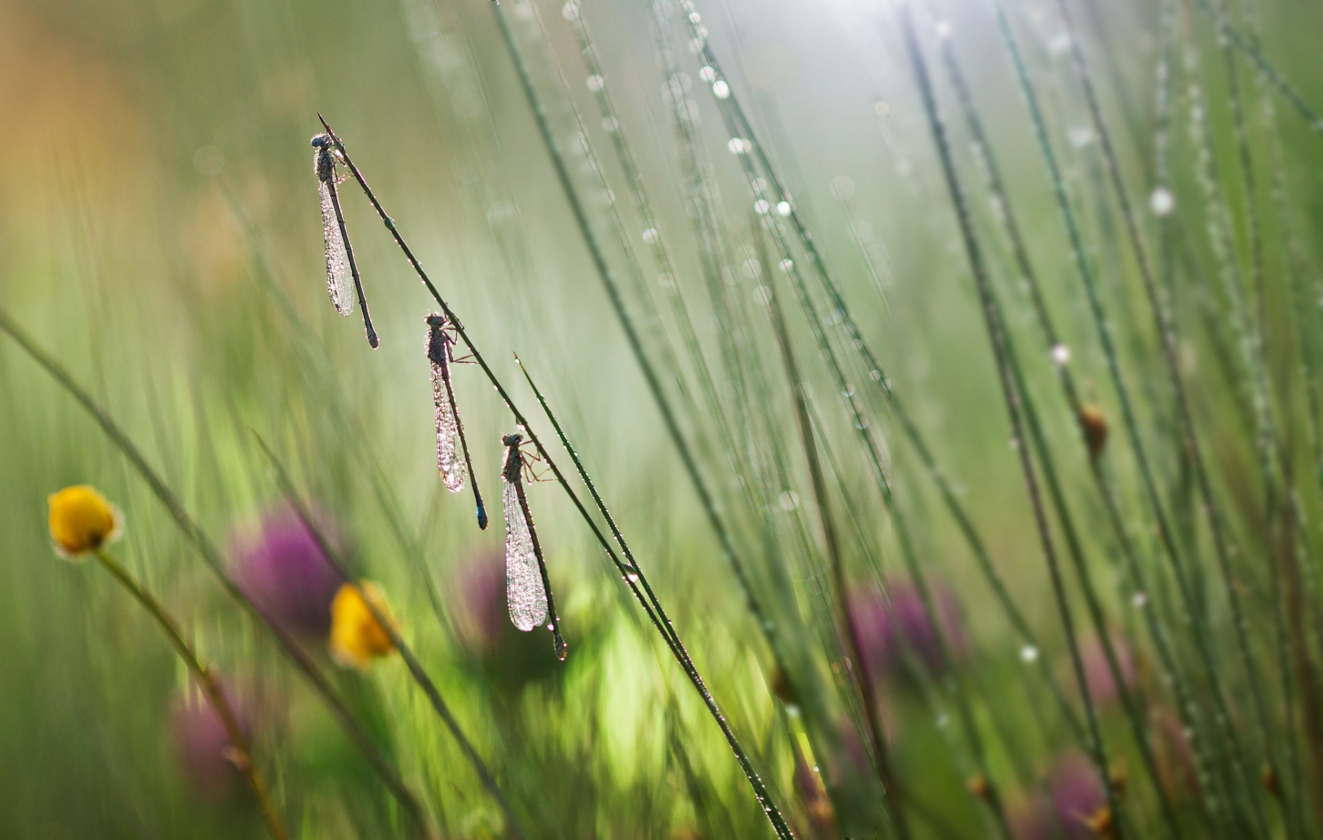 Drei Libellen sitzen an einem regnerischen Sommertag auf einer nassen Segge