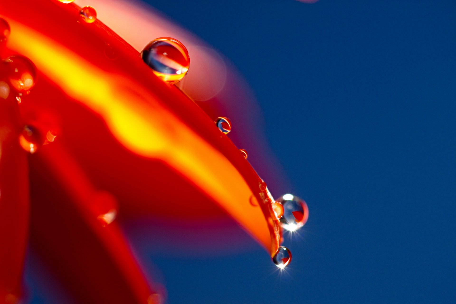 Der Glanz eines Wassertropfen auf einem orangefarbenen Blütenblatt