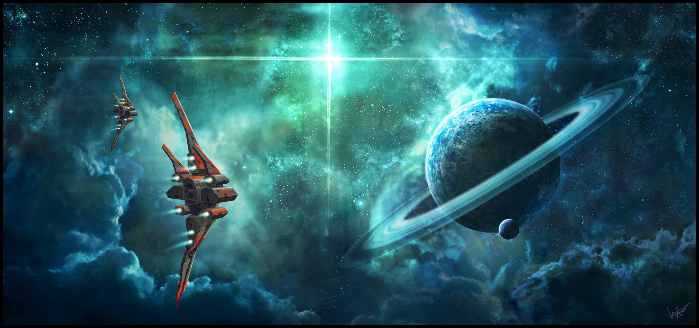 Blick von der Bergschlucht auf die sich nähernden Planeten