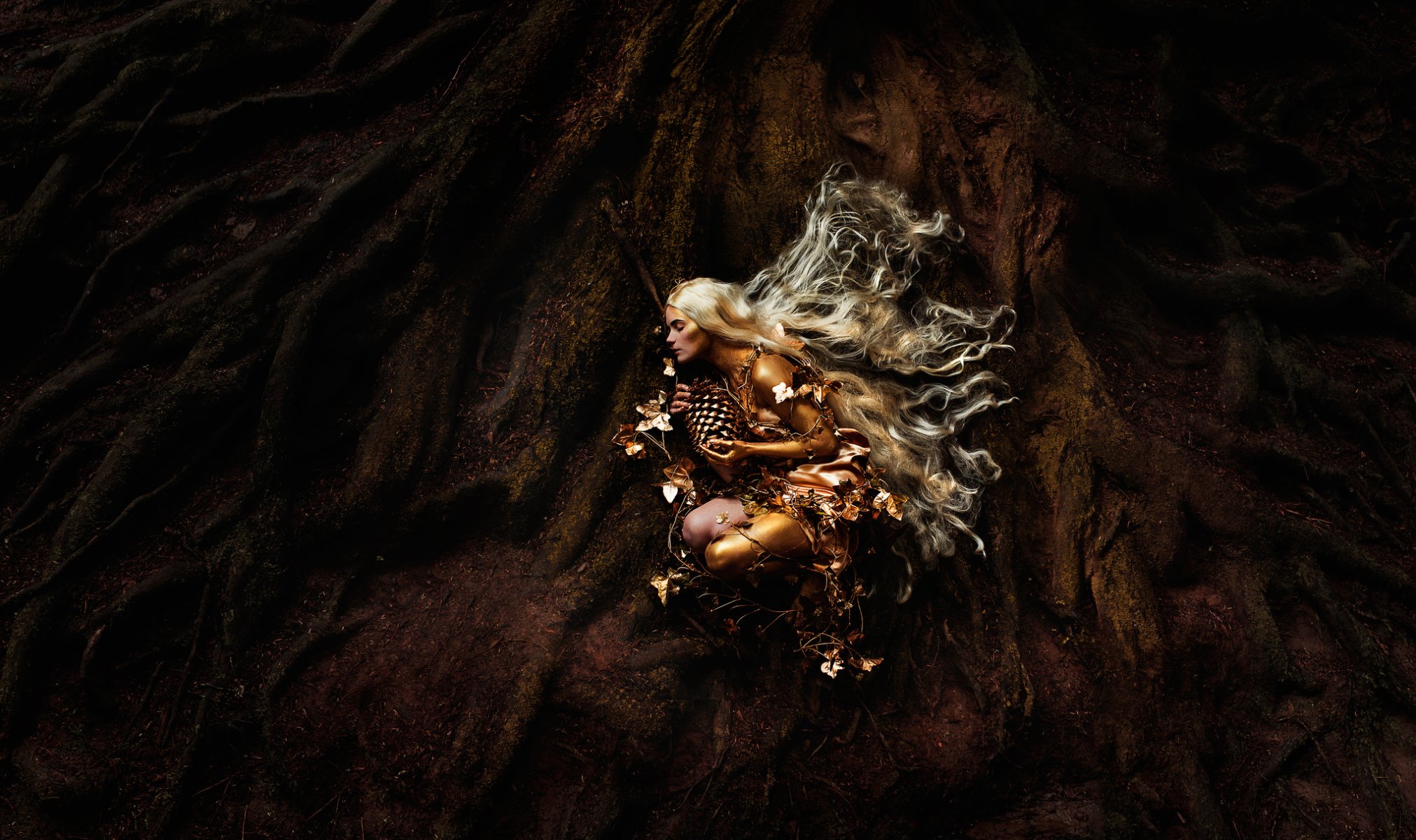 Fantastisches Mädchen mit langen weißen Haaren, ein Baum ist eine mythische Kreatur