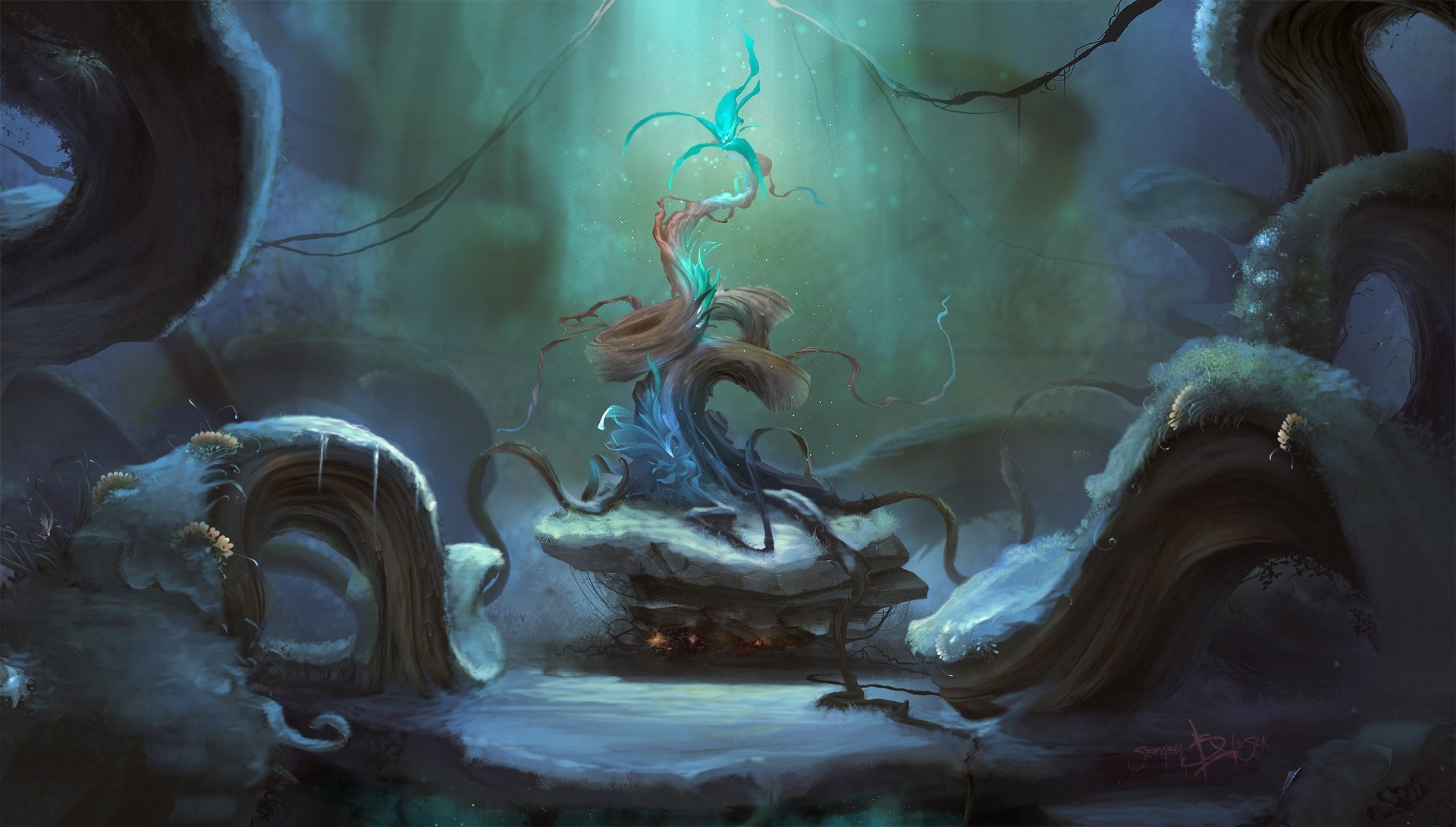 Fantasie Wald Bäume magische Blume Licht