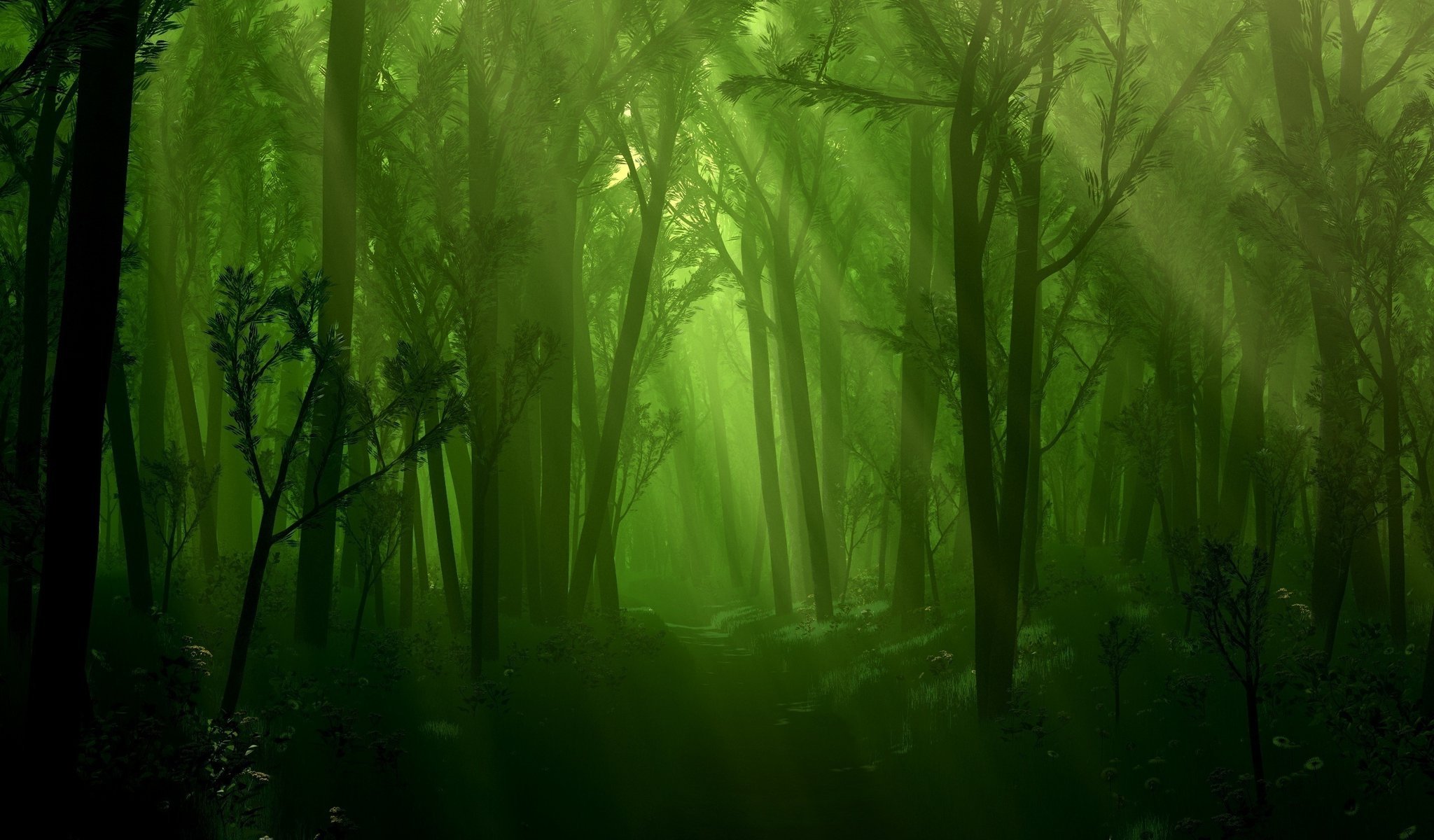 Stimmungsvoller grüner Wald mit schwachem Licht
