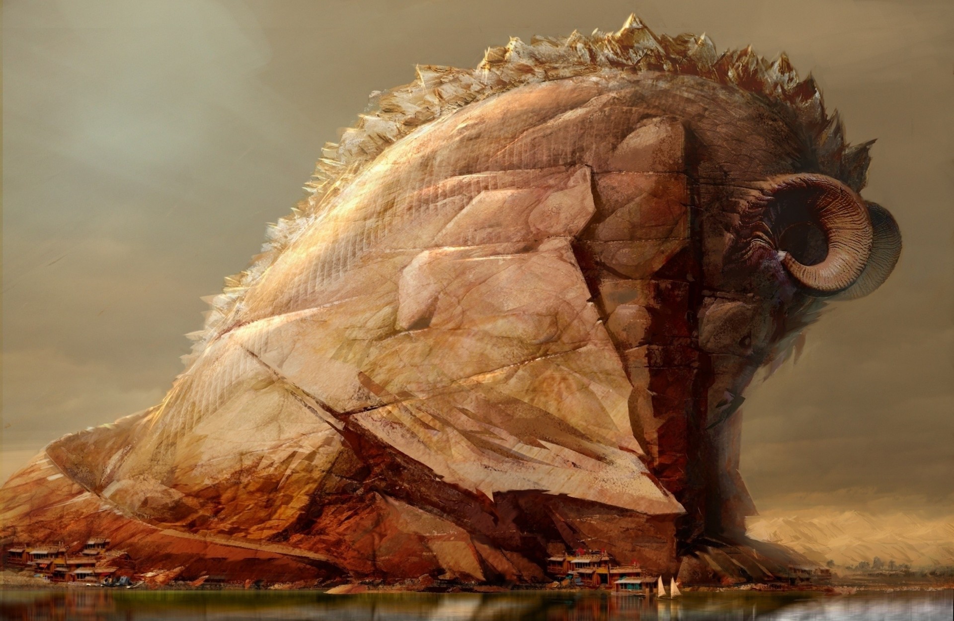 Eine fantastische Welt mit Bergen, Säulen und Gestrüpp