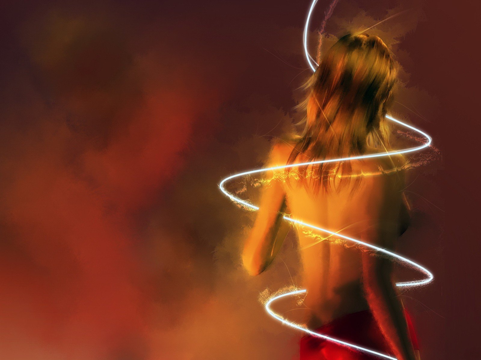 Rückansicht eines Mädchens auf einem rot-orangefarbenen Texturhintergrund