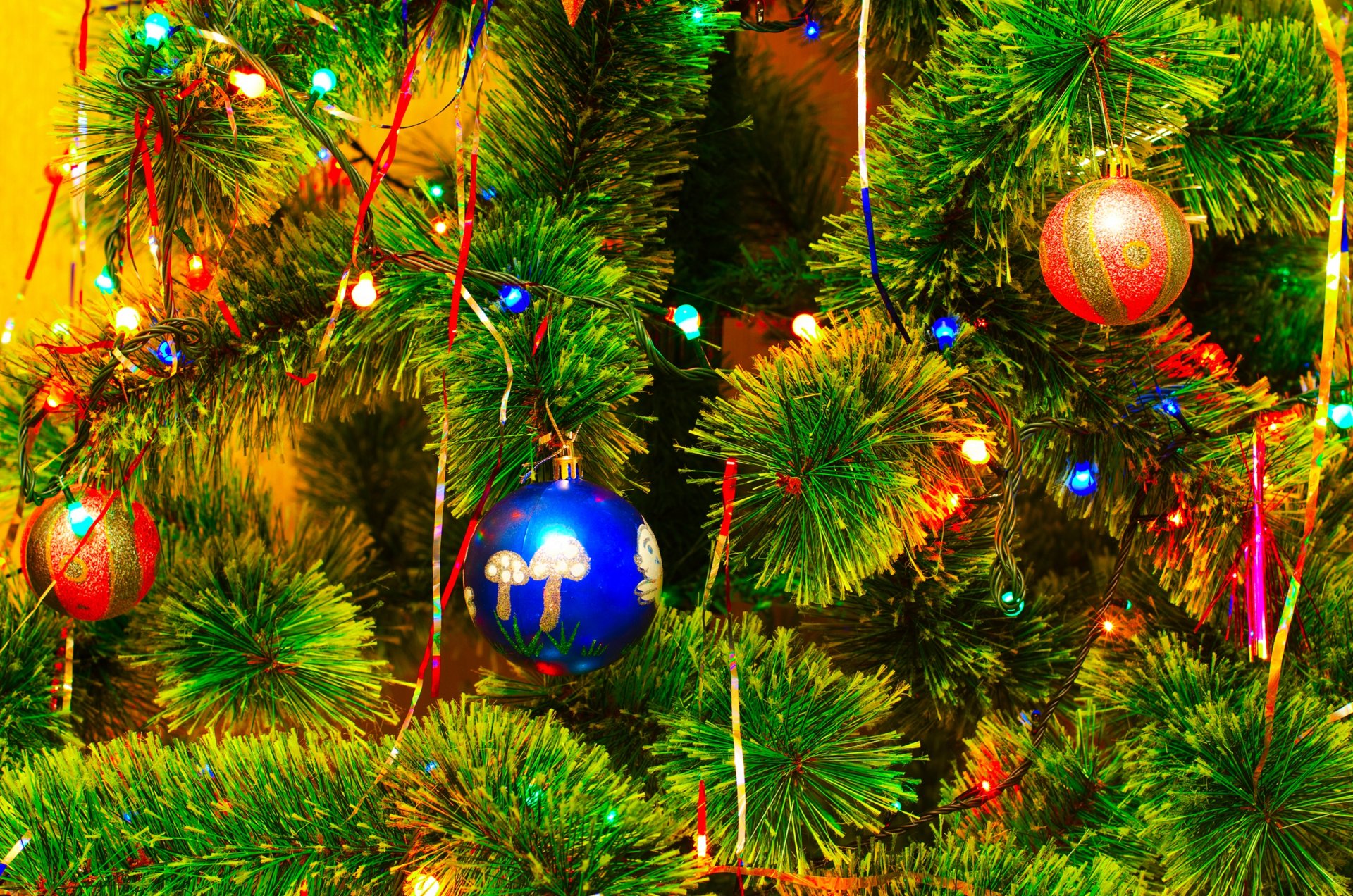 Schneemann Weihnachten Spielzeug auf dem Hintergrund eines geschmückten Weihnachtsbaumes
