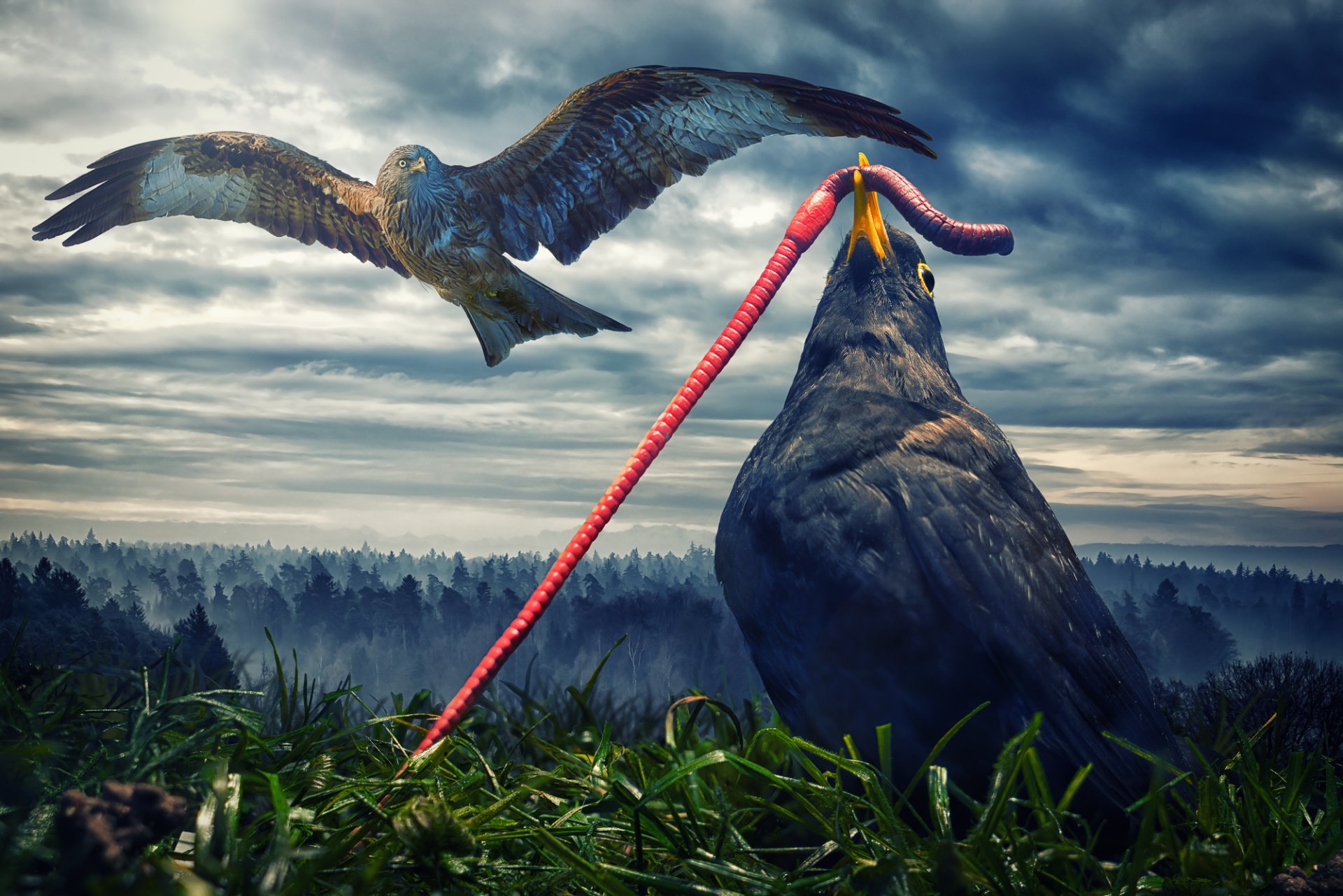 Helle Sonne am klaren Himmel. Ein Zweig, auf dem ein Vogel mit Küken sitzt