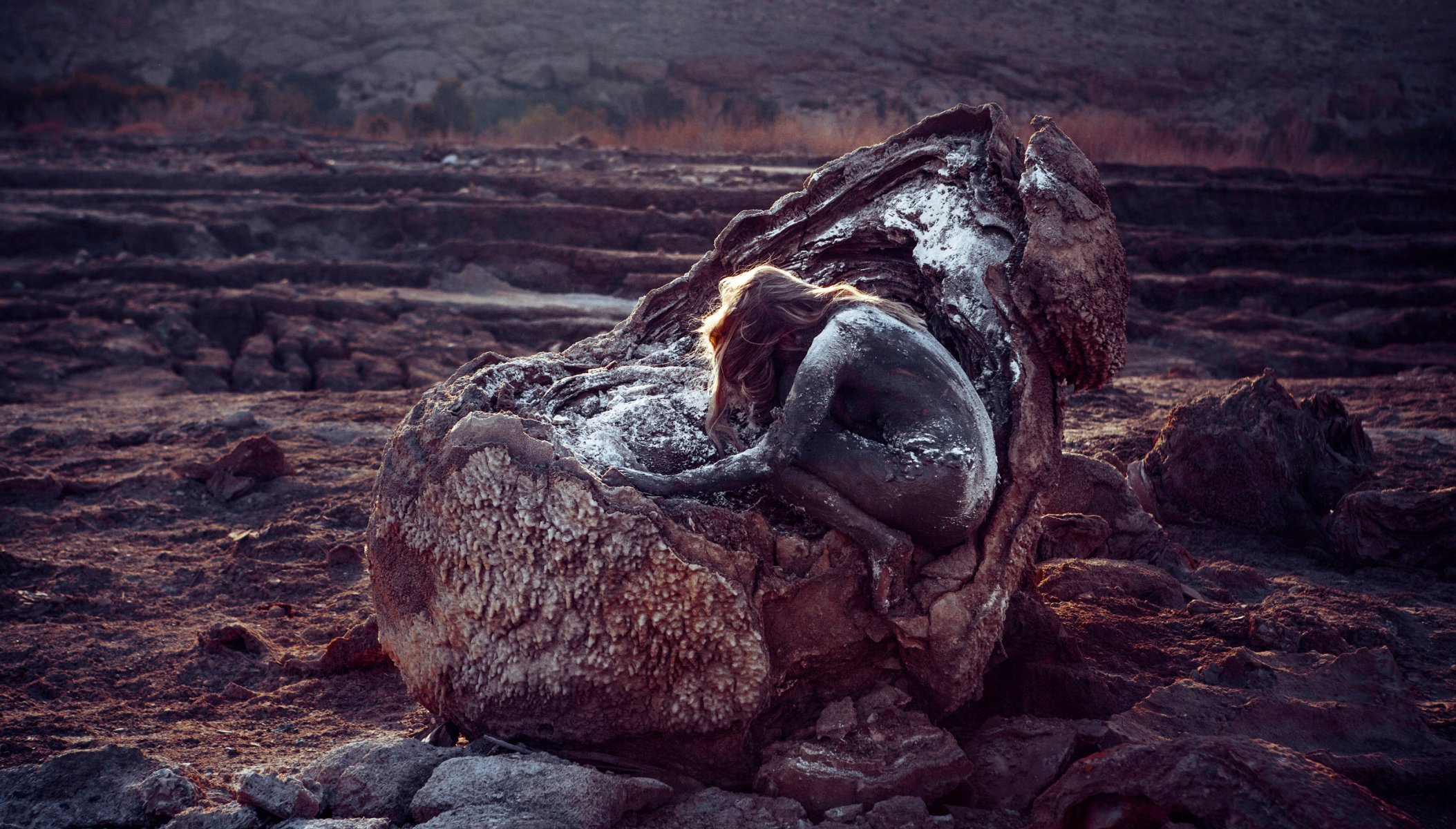 Mädchen, das mit riesigen Ameisen auf dem Sand in einer Scheune sitzt