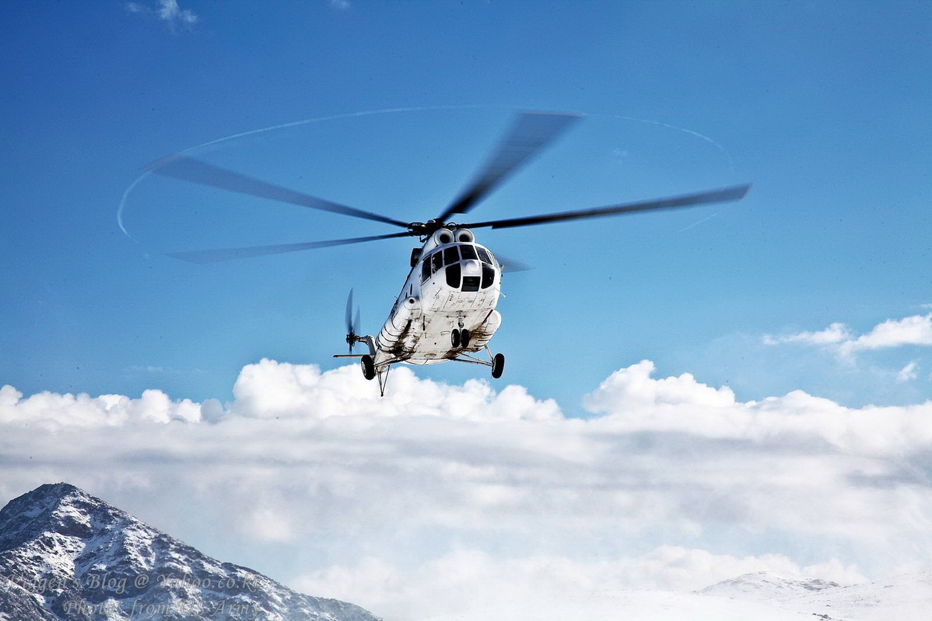 Der Hubschrauber fliegt in der Luft über Wolken und Bergen