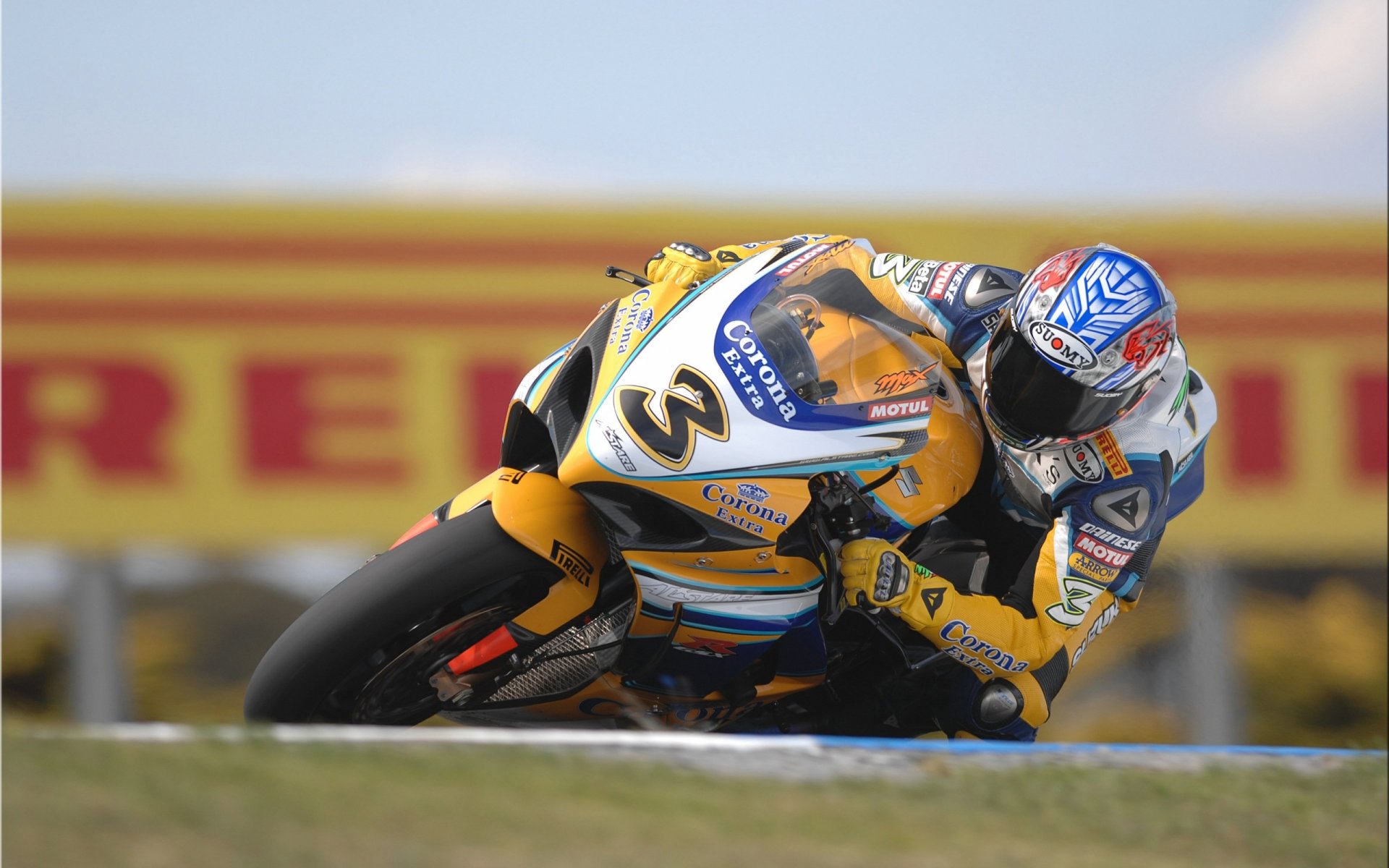 Motorradfahrer auf gelbem Motorrad in Kurve geraten