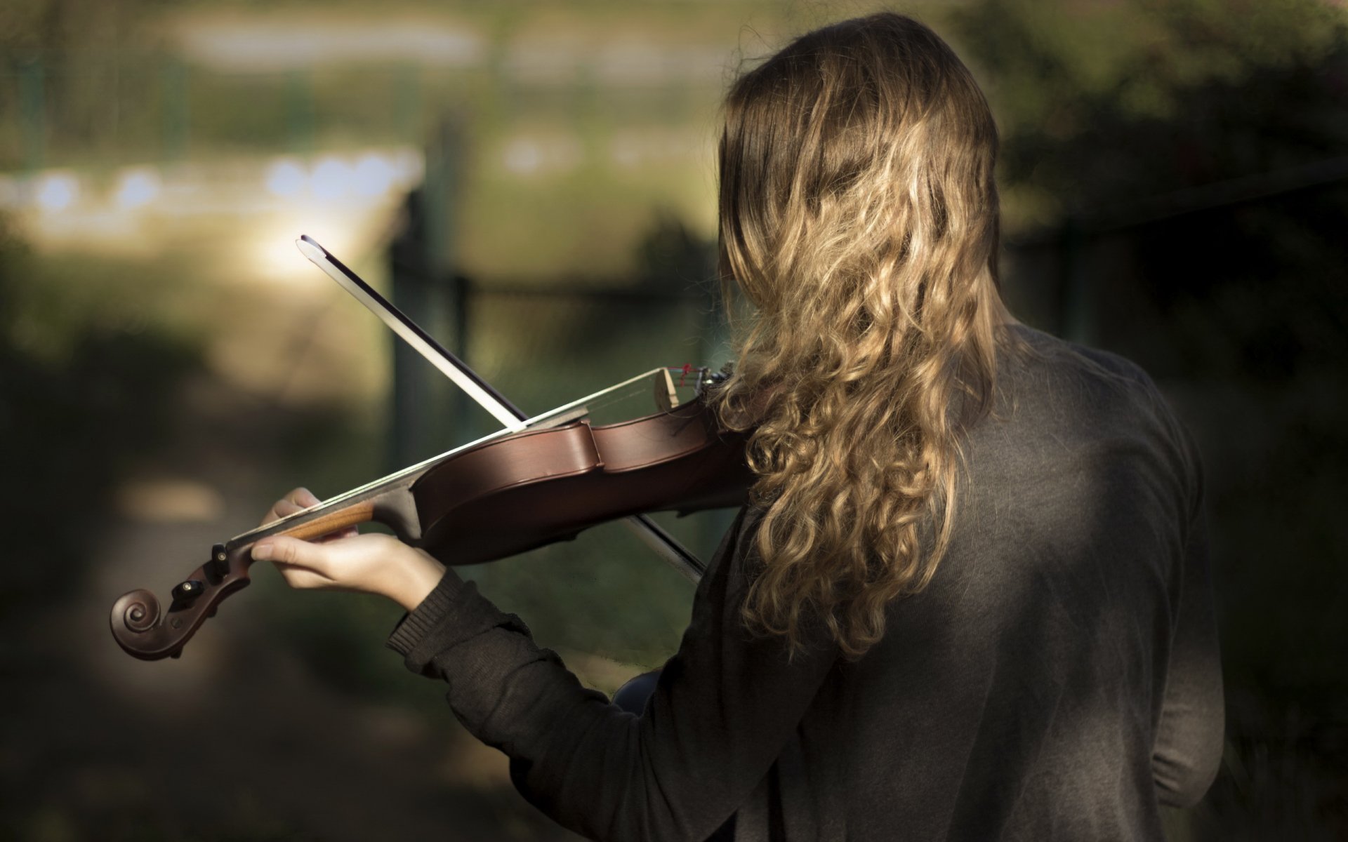 Mädchen spielt Gitarre vor Sonnenuntergang Hintergrund