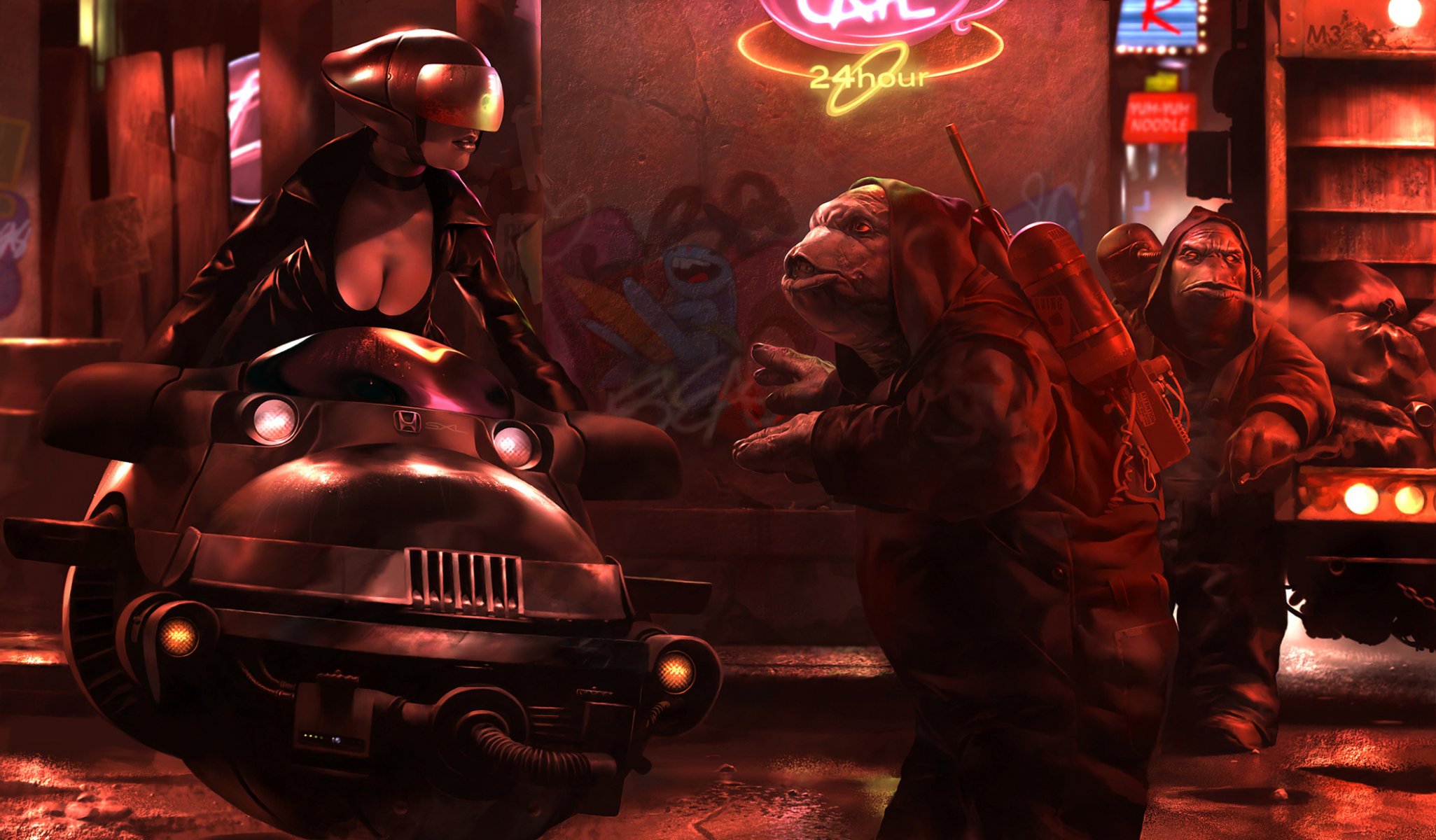 Futuristisches Bild eines Mädchens auf einem Motorrad und eines Monsters
