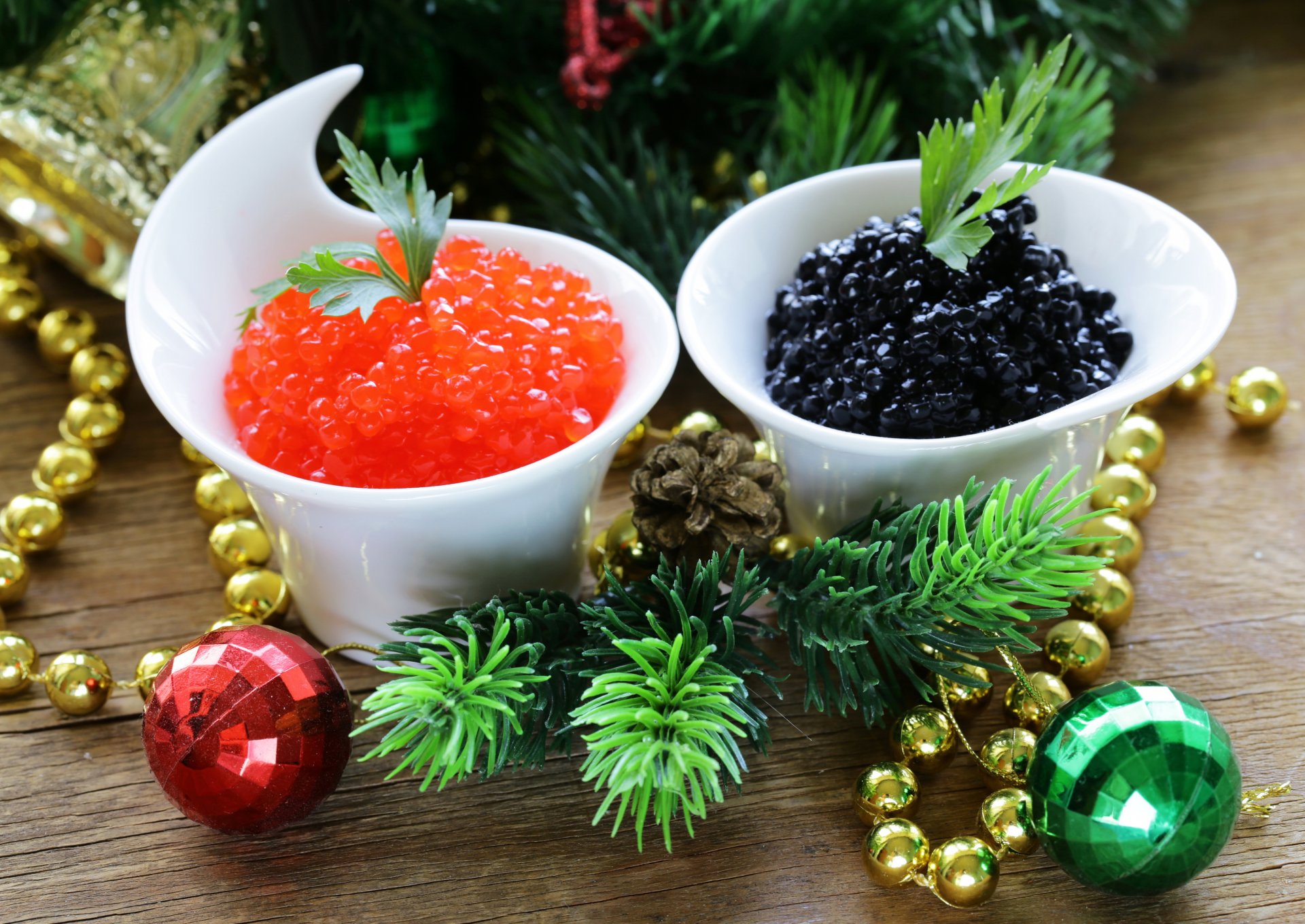 Neujahrs-Stillleben mit rotem und schwarzem Kaviar
