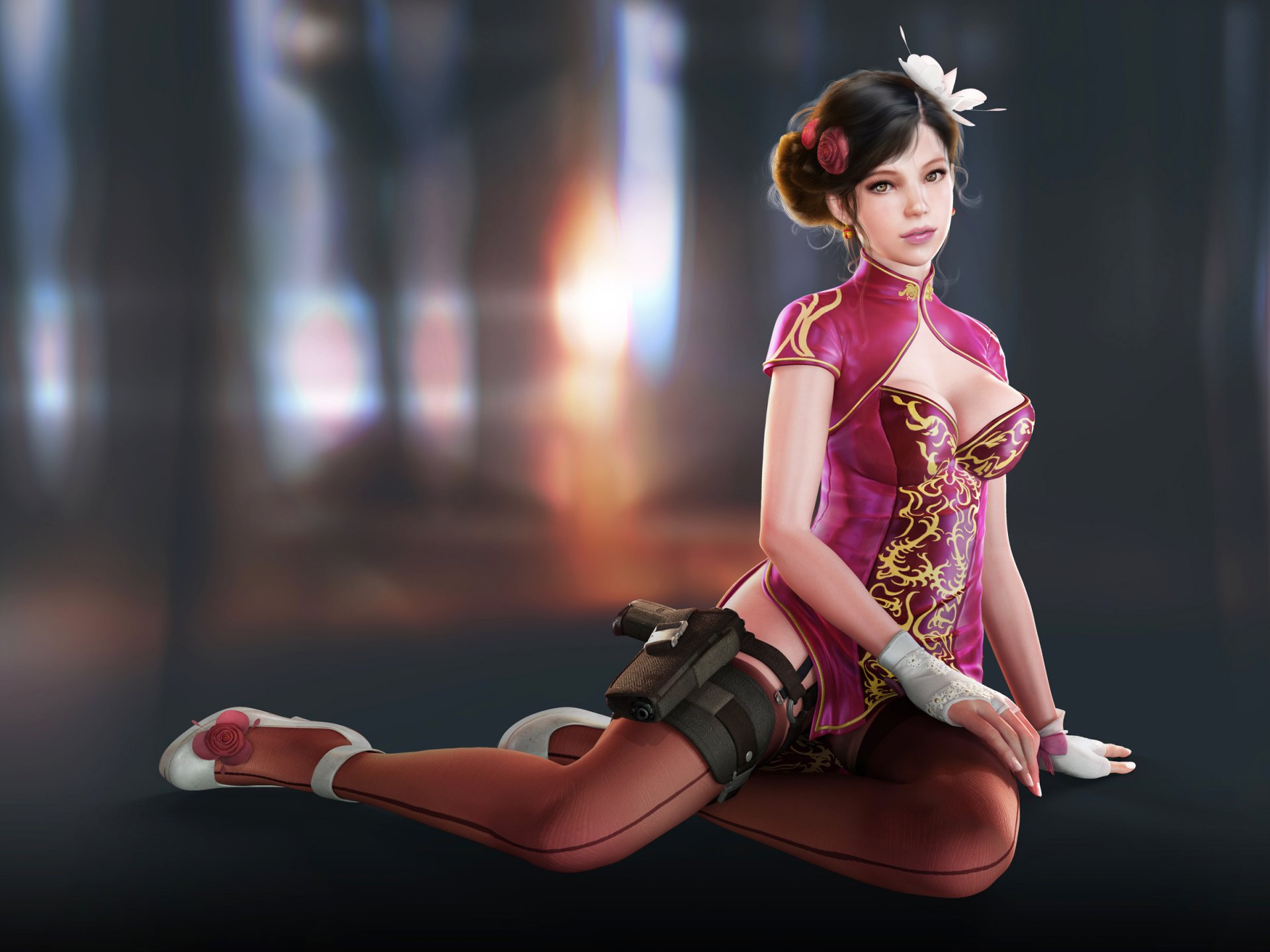 Mädchen mit lila Haaren und einer Pistole in den Händen