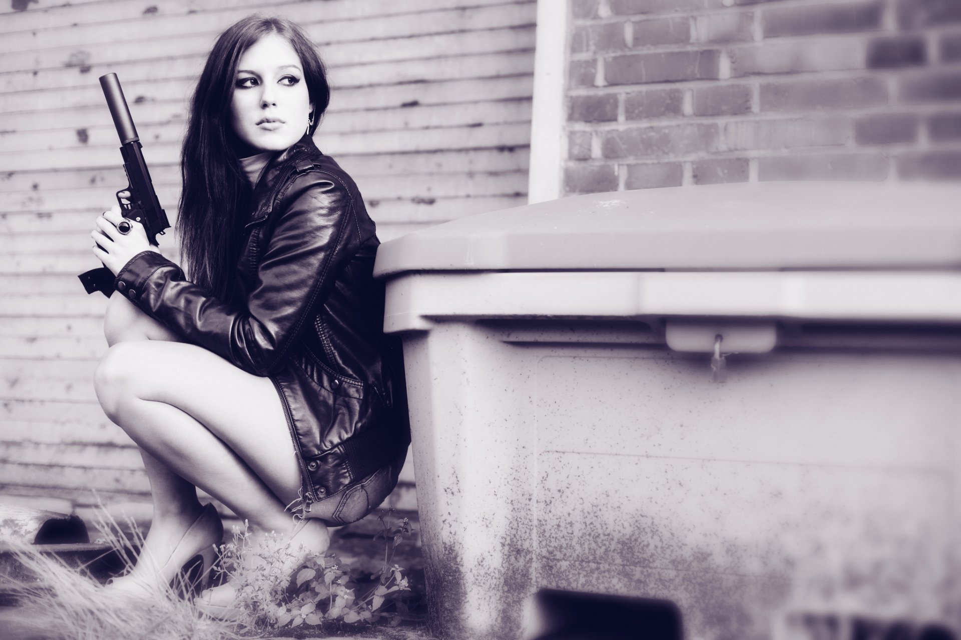 Asiatische Mädchen mit einer Pistole in den Händen