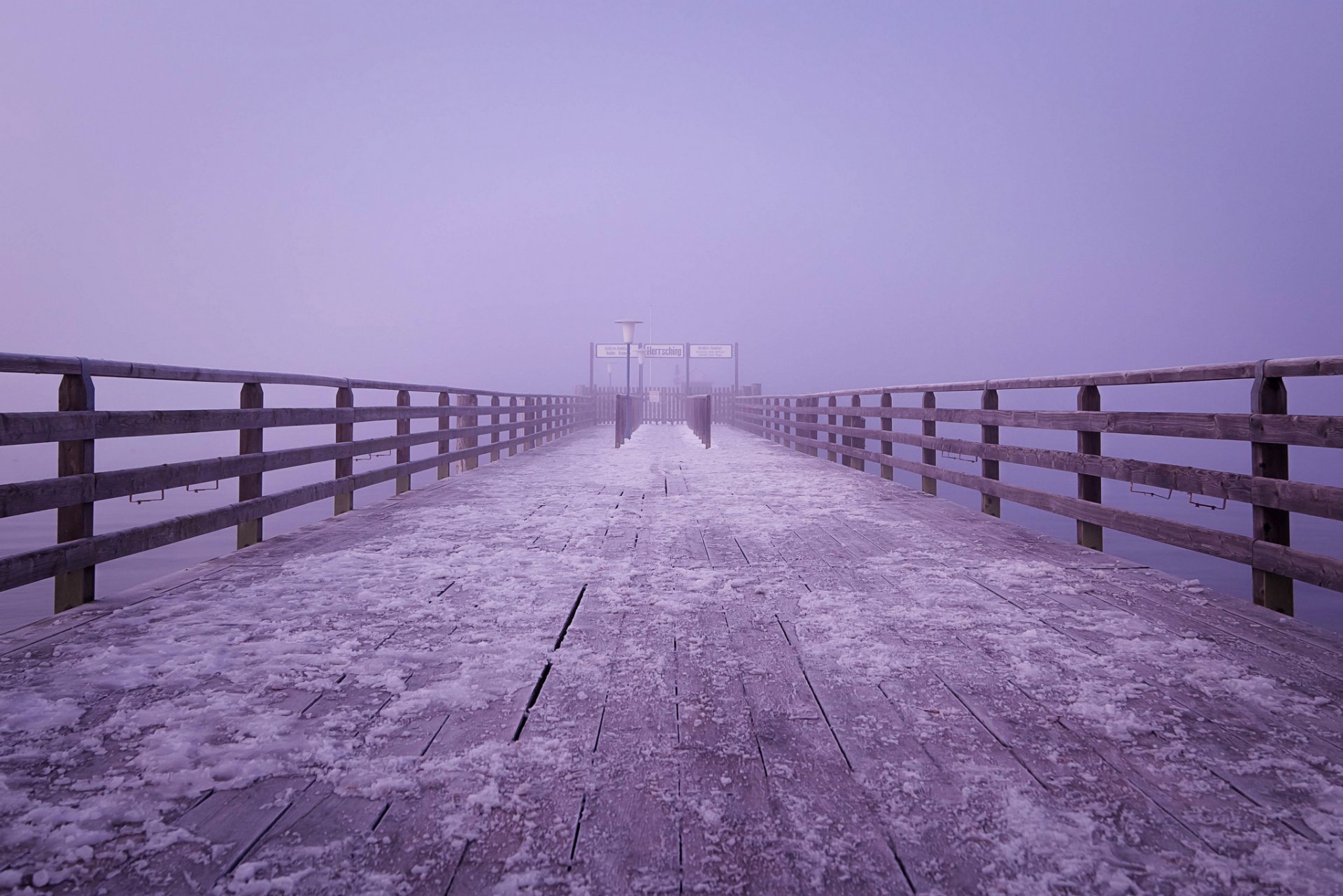 Der Fliedernebel fiel auf eine mit Schnee bedeckte Holzbrücke