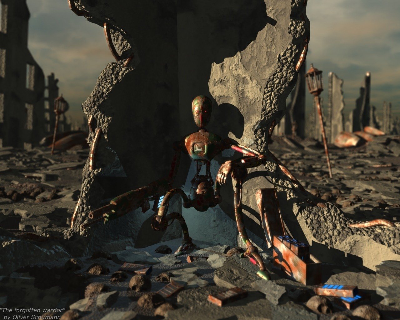 Ruinen und ein Roboter auf der Straße aus dem Spiel