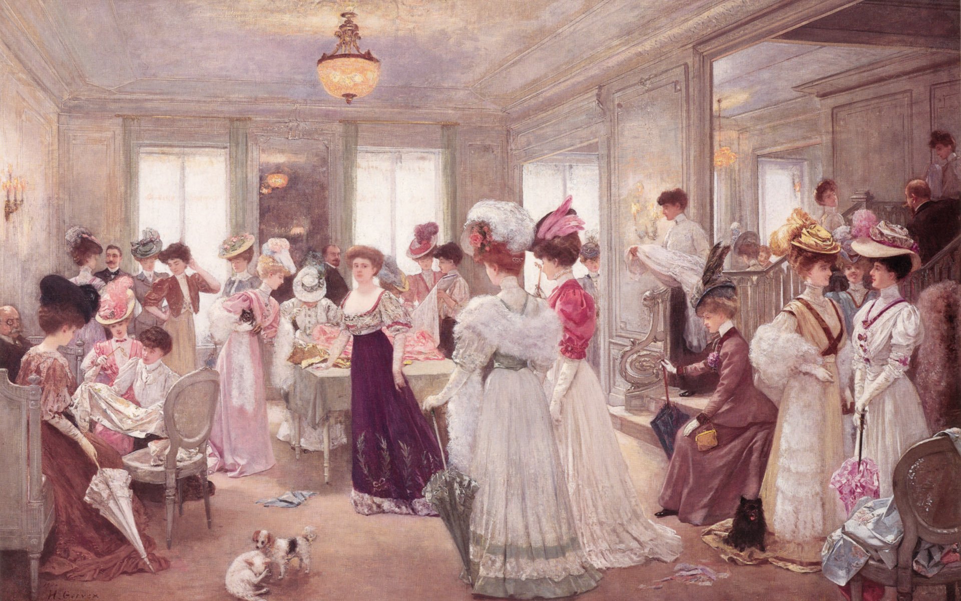 Damen in schönen Kleidern und ihre Hunde