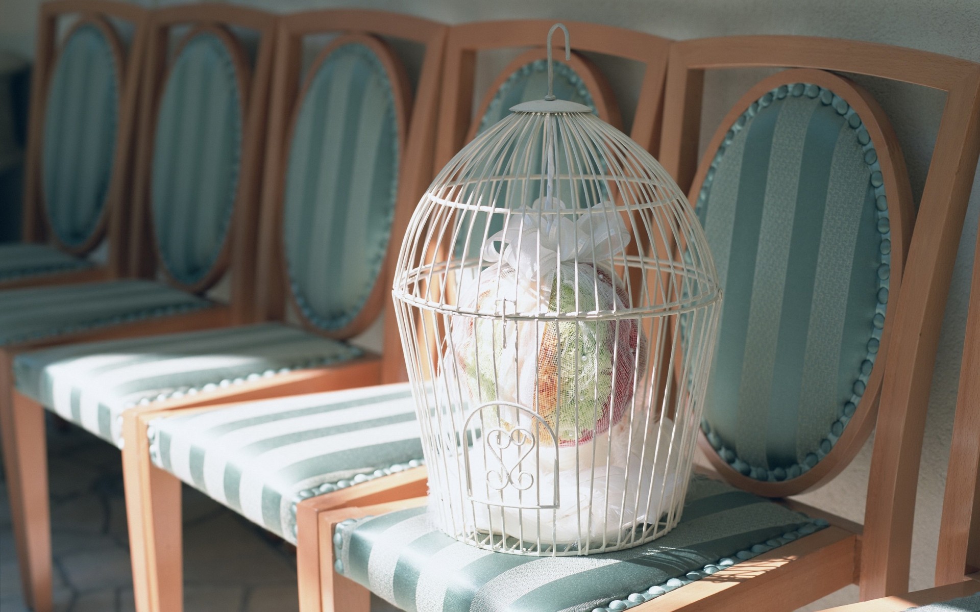 Brautstrauß in einem Käfig auf einem gestreiften Stuhl
