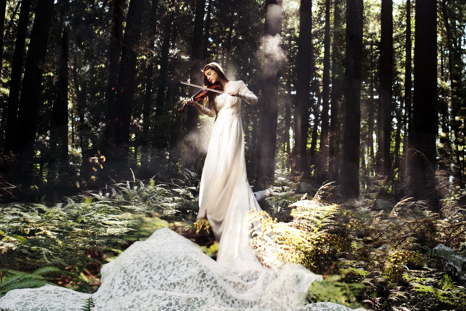 Mädchen mit einer Geige in einem weißen Kleid auf einem Waldhintergrund