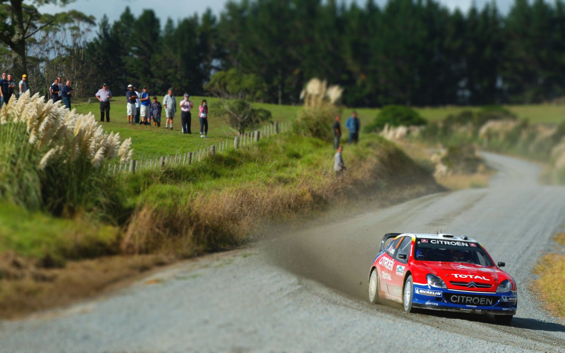 Zuschauer bei der Rallye beobachten den Citroen beim Abbiegen