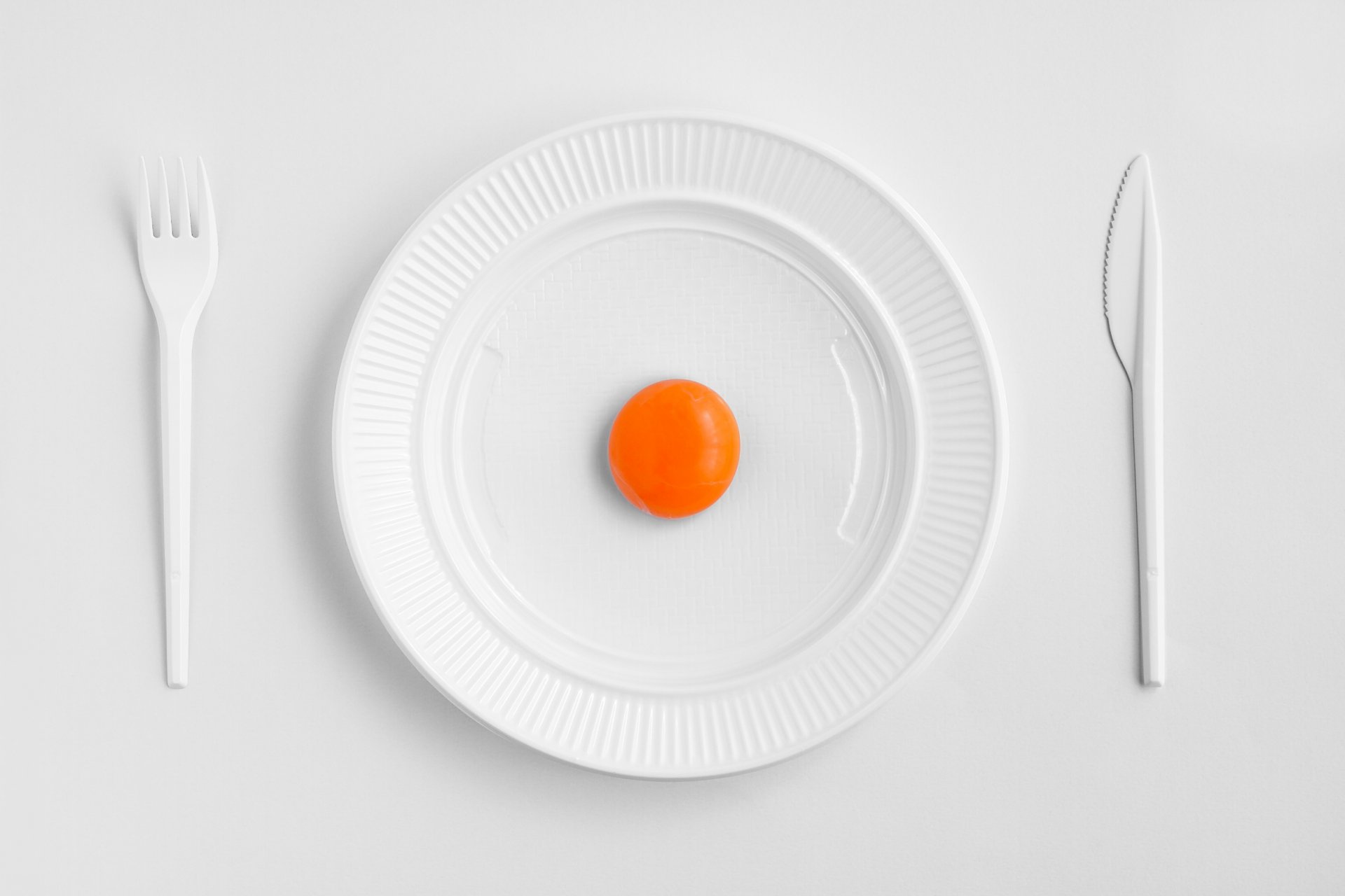 Weißer Teller mit Kirschtomate und Gabel auf weißem Tisch