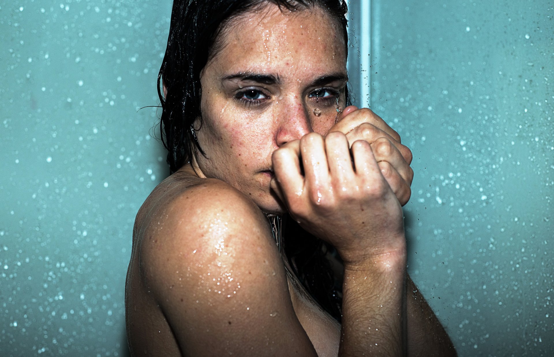Mädchen mit dunklen Haaren steht unter der Dusche