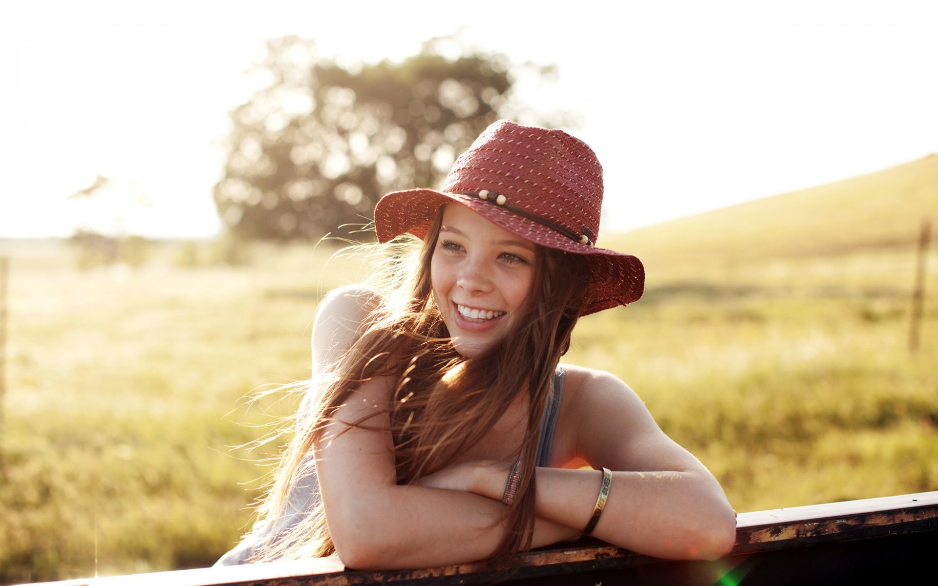 Mädchen im weißen Kleid hält einen gestreiften breitkrempigen Hut