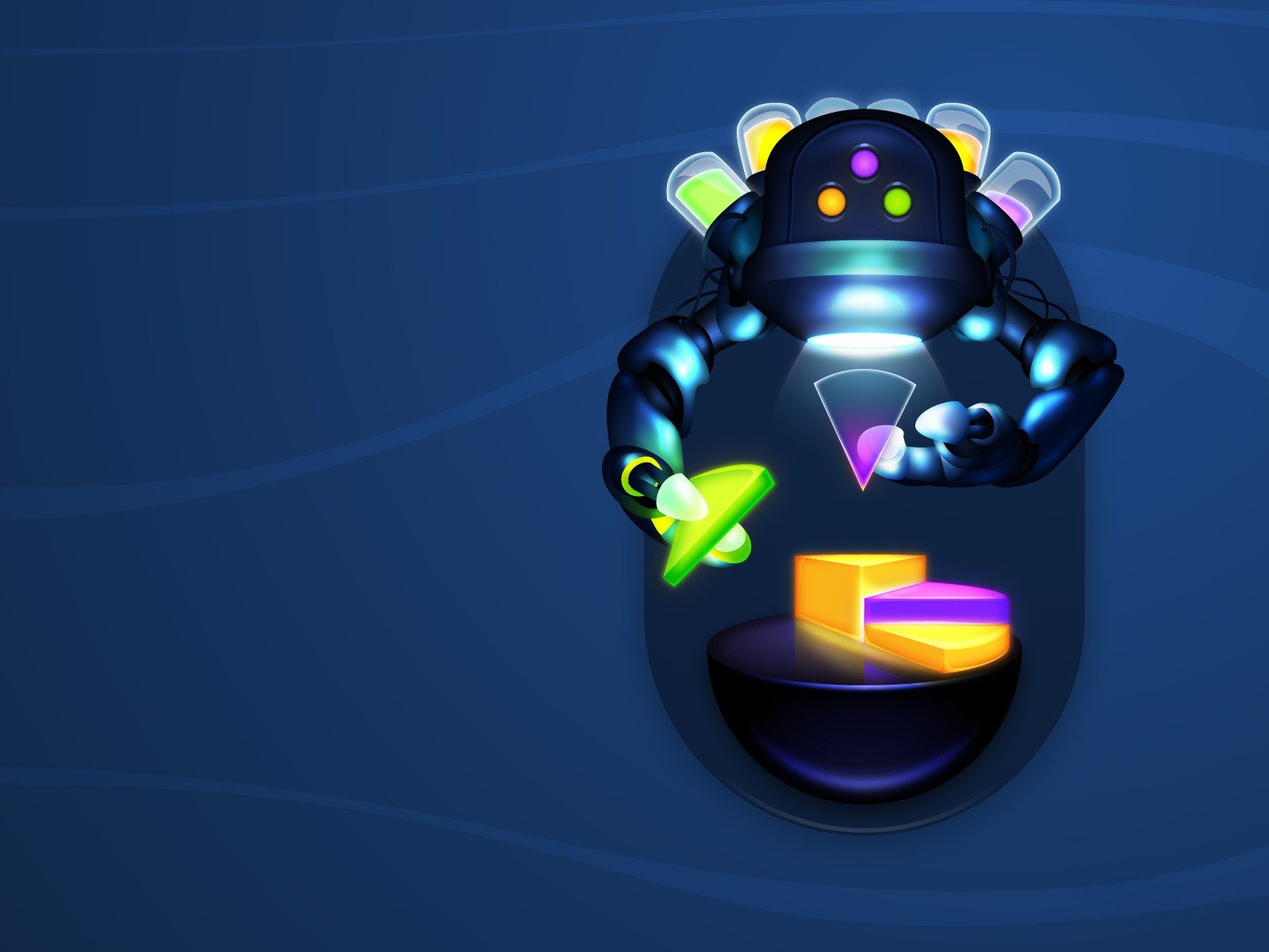 Auf blauem Hintergrund hält der Roboter helle Elemente in seinen Händen