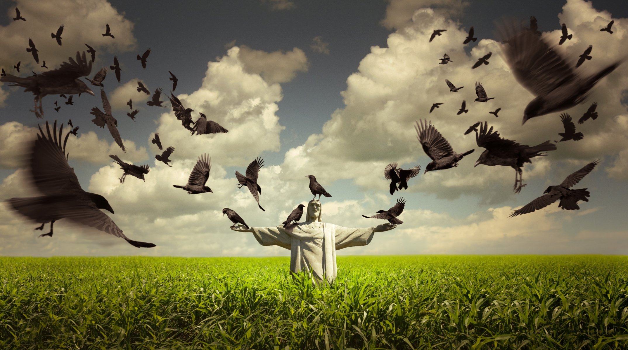 Statue auf einem Feld mit Vögeln am Himmel