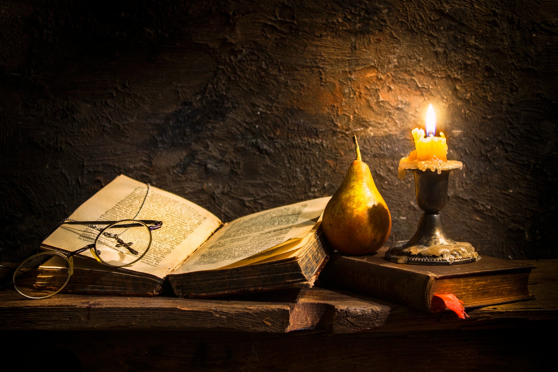 Eine Kerze beleuchtet ein altes Buch und eine Brille